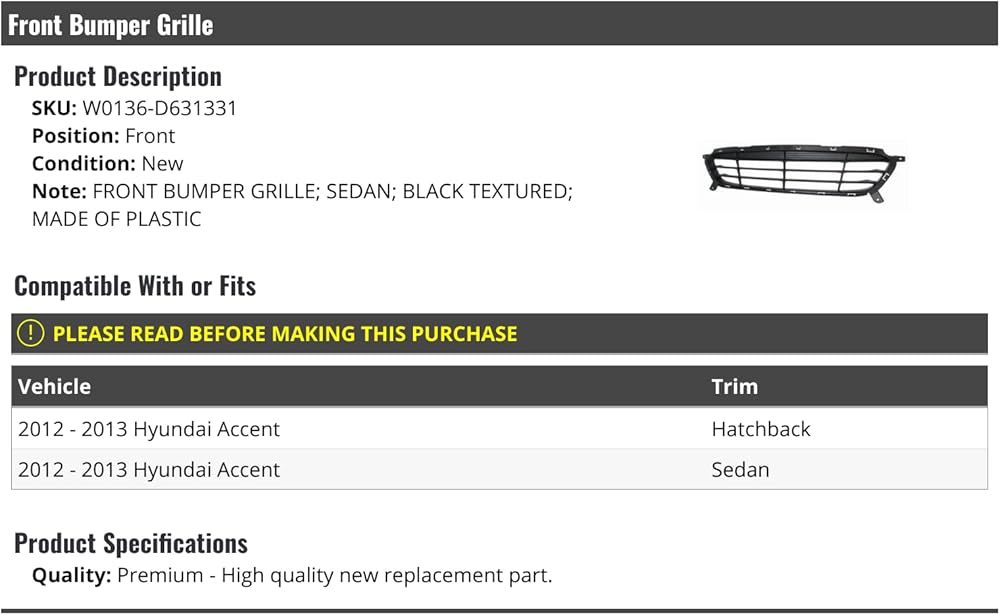 - Compatible with or fits: 2012 - 2013 Hyundai Accent Sedan
