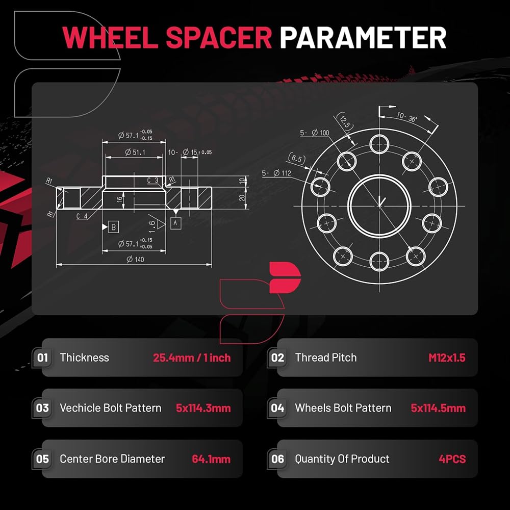 مواصفات المنتج: مجموعة من 4 قطع بسمك 1 بوصة /25.4 مم | نمط مسمار العجلة 5 × 114.3 مم | تجويف مركزي 64.1 ملم | مسافة الخيط M12x1.5 | قفازات واقية| تنظيف كرات الأسلاك