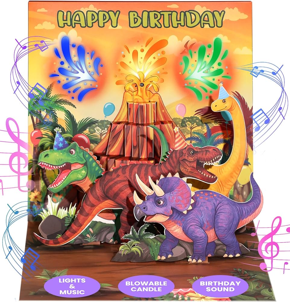 بطاقات عيد ميلاد موسيقية منبثقة على شكل ديناصور كورالوجو - بطاقات عيد ميلاد بركان مع شمعة قابلة للنفخ، عمر DIY، أضواء، موسيقى، وملاحظة فارغة، هدية مضحكة للأولاد وحفيد الأطفال