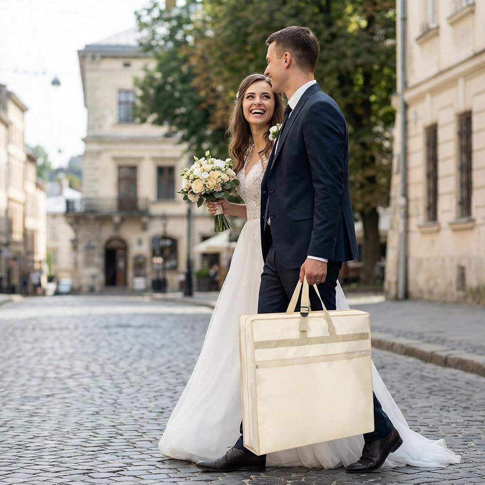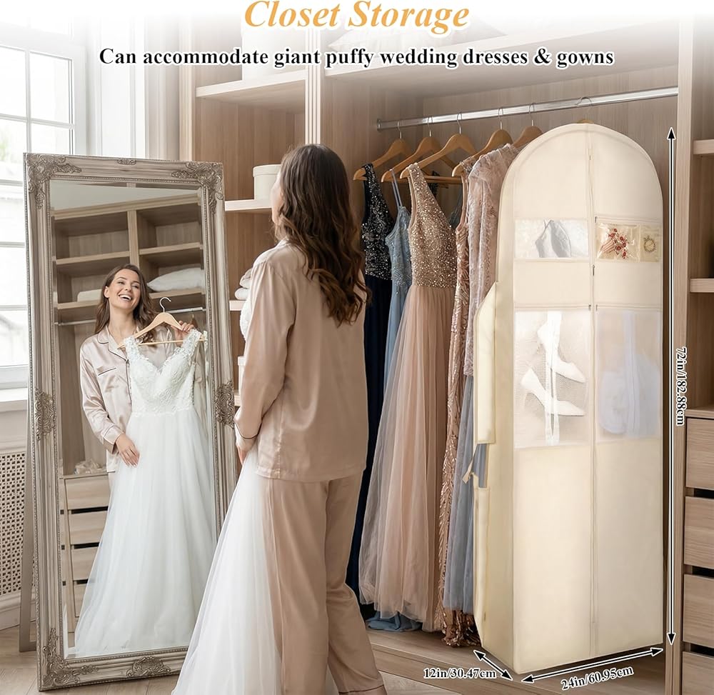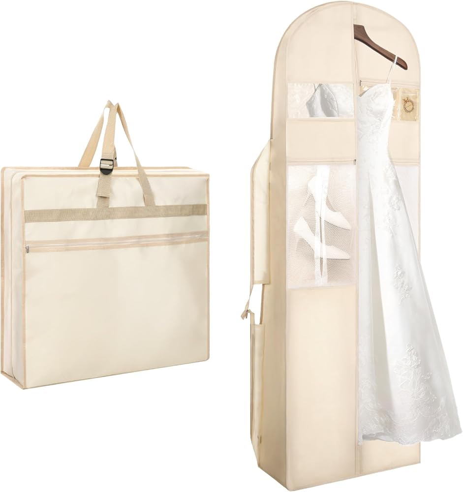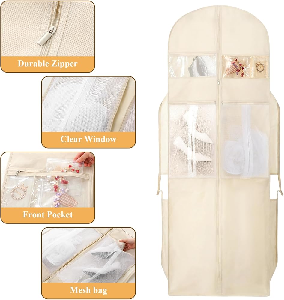 【Reliable Materials】Made with a combination of good Oxford cloth and non-woven fabric, the material is thick and wrinkle-resistant, can be folded multiple times for storage without deformation, and will maintain its good condition even after long-term use, providing reliable help your wedding dress. It features a built-in dustproof and waterproof design, making everyday care easier. Equipped with a smooth stainless steel zipper.