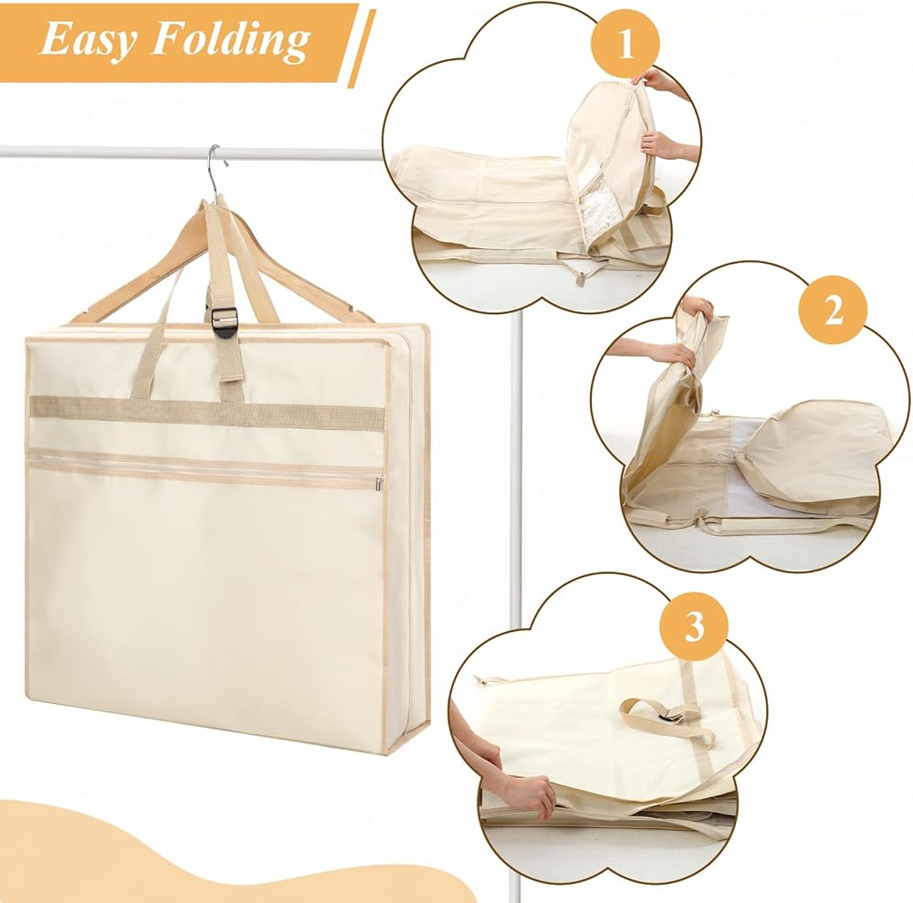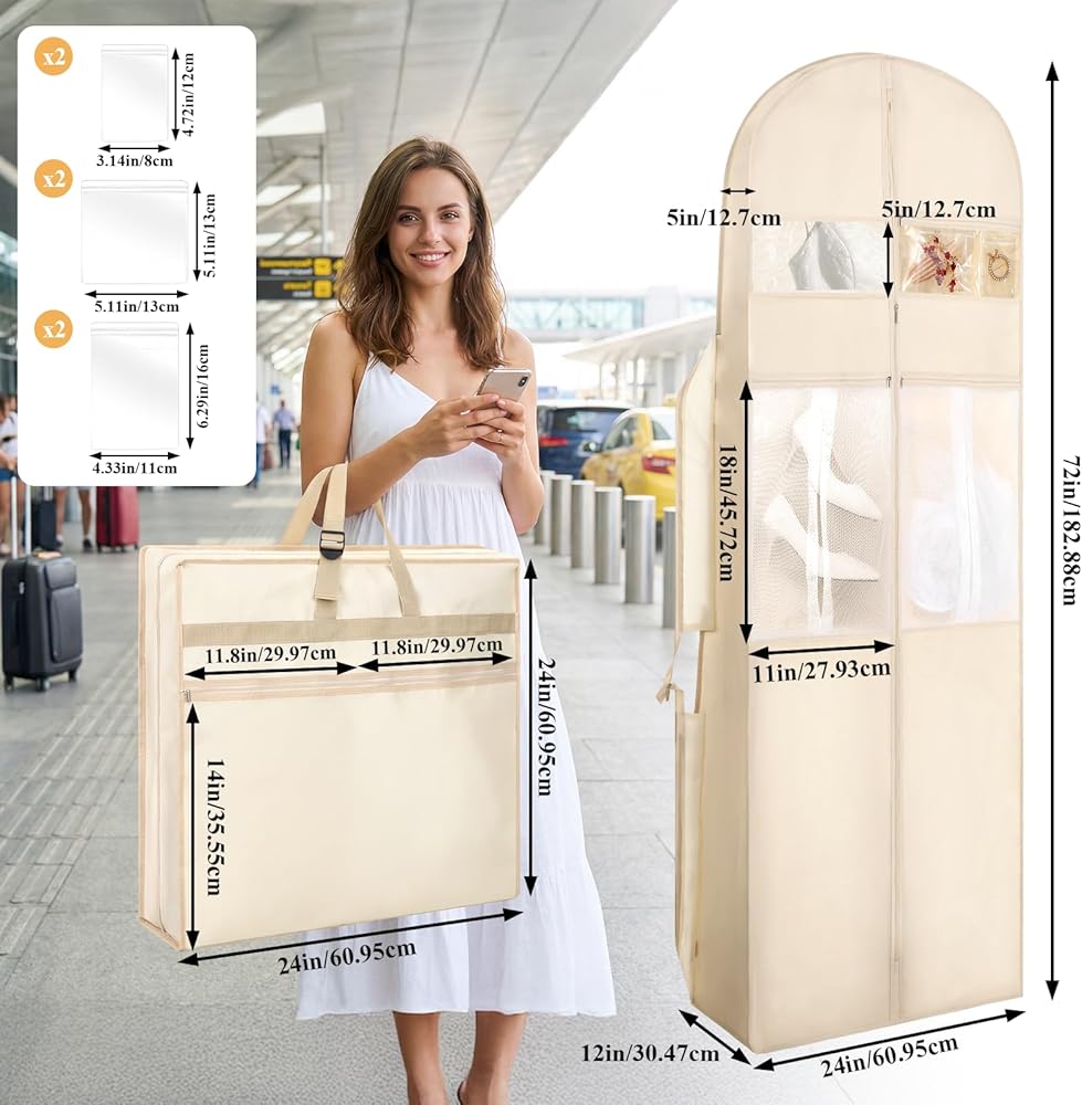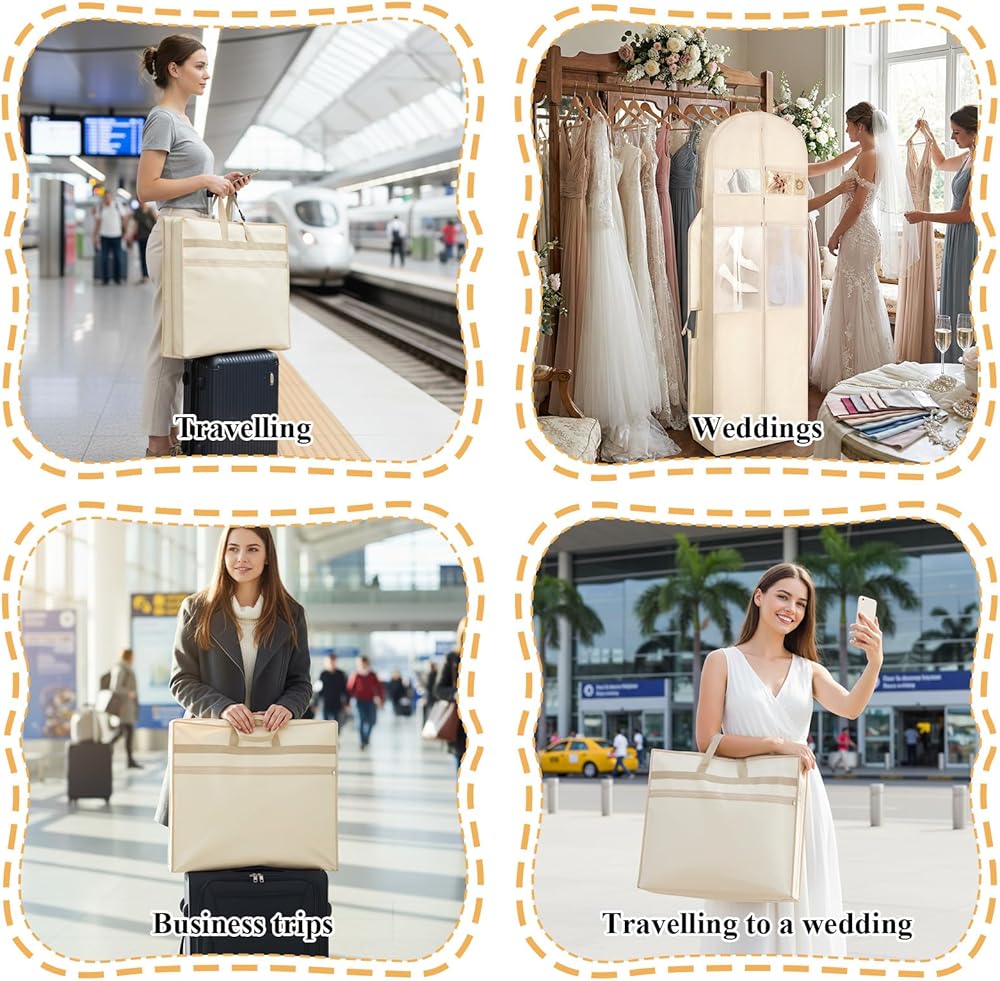 【Compact and Portable】When folded, it measures only 25 inches x 24 inches x 6 inches, making it small and space-saving, easily fitting into a suitcase; when unfolded, it boasts a large capacity of 72 inches x 24 inches x 12 inches, easily accommodating wedding dresses, large shawls, and bridesmaid dresses. It can function as both a dress bag and a handbag, being lightweight and portable while effectively preventing wedding dresses from wrinkling.