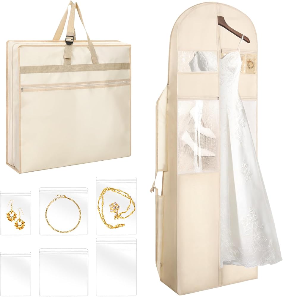 【Reasonable Combination】Features 6 compartments + 6 accessory pockets. Two transparent PVC pockets are convenient for storing small items such as photos, and cards, making them easily visible. Two breathable mesh pockets are specifically for shoes, and two additional pockets can hold jewelry, veils, and cosmetics. The 6 accessory pockets keep rings, bracelets, and earrings organized, ensuring your wedding dress and all accessories have their place and are not misplaced.