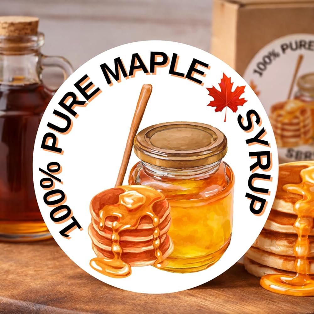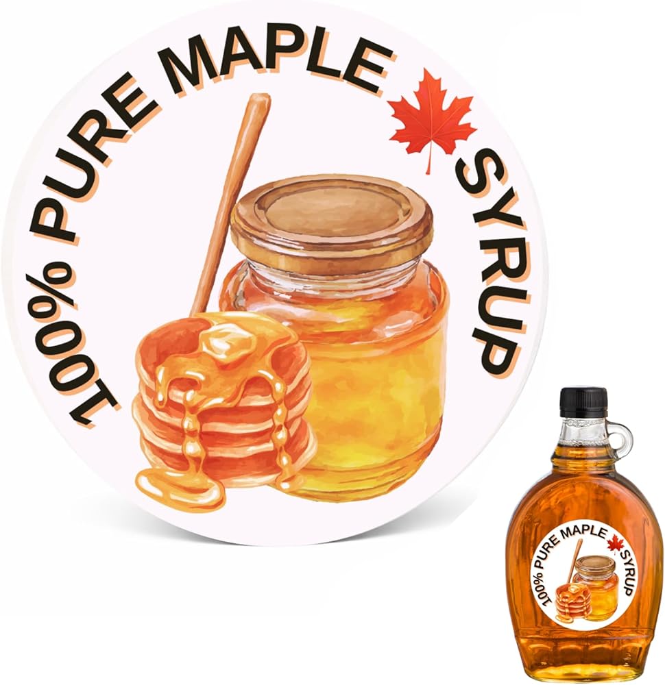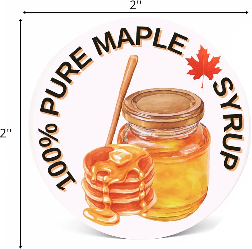 • الحجم المثالي: يبلغ قطر كل ملصق 5 سم (دائري)، ويناسب معظم برطمانات شراب القيقب والزجاجات وبرطمانات الماسون والأباريق الصغيرة.