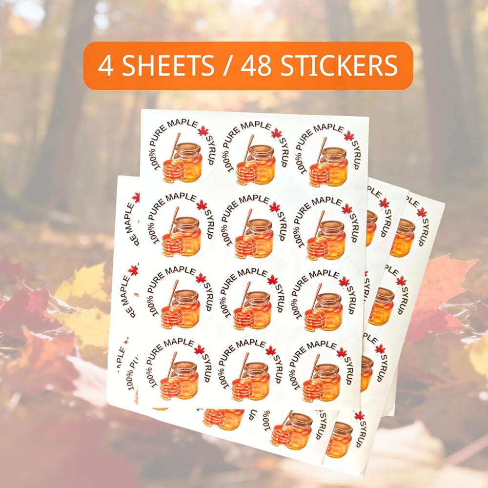• الكمية: 48 ملصقًا دائريًا لشراب القيقب في كل عبوة، كل منها مطبوع عليه "شراب القيقب النقي بنسبة 100%"