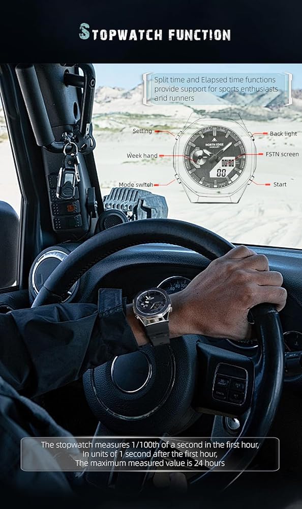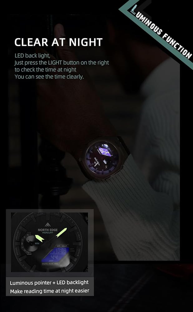 • ساعة رياضية متعددة الوظائف للاستخدام اليومي والخارجي. مجهزة بالتوقيت العالمي ومؤقت العد التنازلي وساعة التوقف (1/100 ثانية) ورنين كل ساعة، توفر هذه الساعة الرقمية للرجال جميع الوظائف العملية اللازمة للتمرينات والسفر والمشي لمسافات طويلة والروتين اليومي.