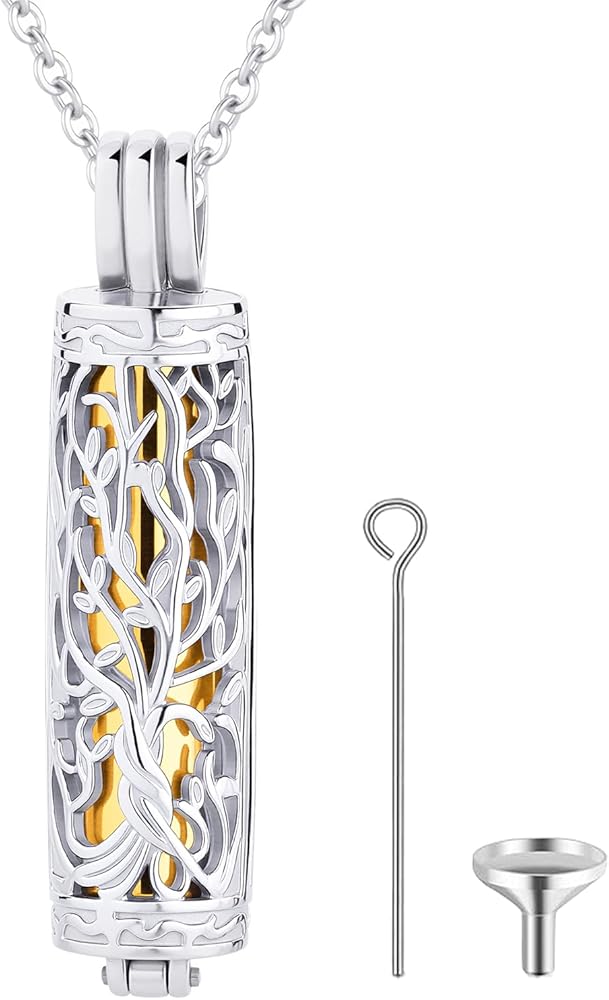 【مادة قلادة رماد شجرة الحياة】مصنوعة من الفولاذ المقاوم للصدأ سعة 316L، قلادة جرة شجرة الحياة الأسطوانية مع تصميم مجوف على شكل شجرة الحياة، مع قارورة أسطوانية مصممة لحمل كمية أكبر من الرماد كتذكير بأن أحبائك معك دائمًا، تصميم بسيط ولامع يجعل مجوهرات الحرق هذه أنيقة