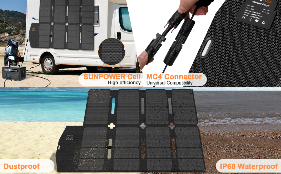 توافق واسع: تحتوي اللوحة الشمسية القابلة للطي SOKIOVOLA بقدرة 100 واط على كابل موصل MC4 4 في 1 (XT60/DC5521/DC8MM/Anderson)، متوافق مع معظم مولدات الطاقة الشمسية في السوق، مثل Jackery/EF ECOFLOW/Rockpals/BALDR/FlashFish /BLUETTI EB70/EB55/EB3A/Anker 521/ALLWEI 300W/500 أو محطات الطاقة ذات العلامات التجارية الأخرى.