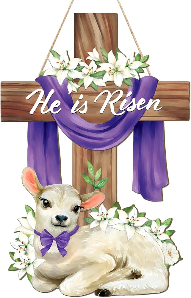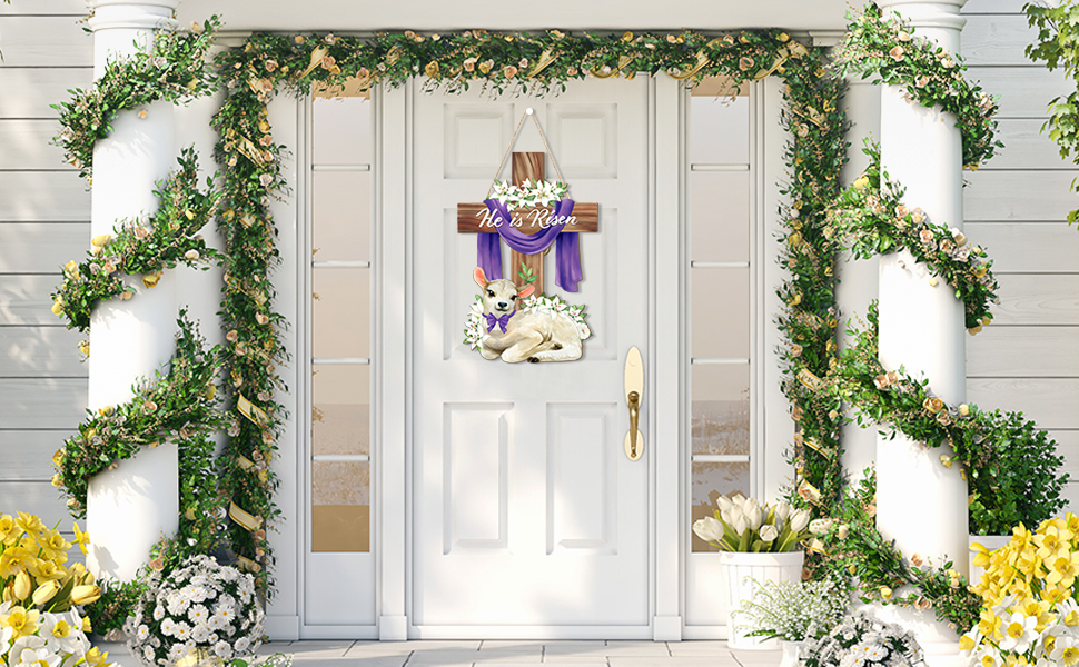 لقد قام بتزيين عيد الفصح بأكاليل خشبية للباب الأمامي، علامة متقاطعة، علامات جدار الباب، الأغنام المسيحية يسوع زهور الزنبق الحلي المعلقة لديكور المنزل الربيعي وحفلات المزرعة