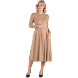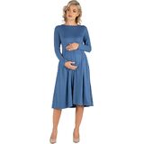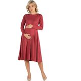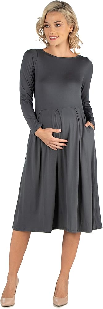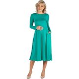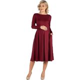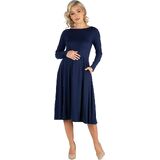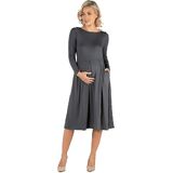 A fall wardrobe must have! This midi maternity dress for women is great for any occasion whether casual or dressy. Featuring a round neckline, long sleeves, midi length hemline, pleated waist, and pockets for a finishing touch. Pair this fit n flare dress with ballet flat for a casual look or create a dressy look with heels. Available in nine beautiful color options, youll want one in every color! Made from a soft and comfortable stretch material that is machine washable for easy care.