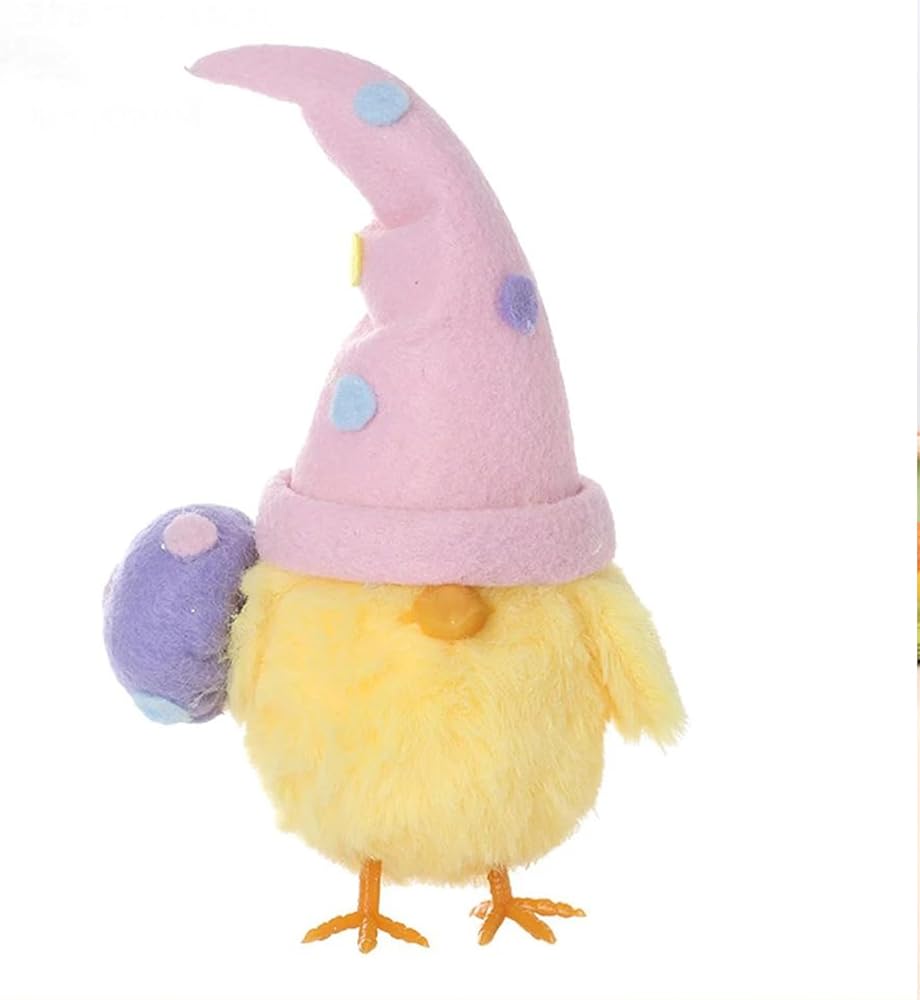 ADORABLE EASTER DESIGN: Charming yellow plush chick figurine wearing a pastel pink polka dot hat and holding a purple Easter egg, perfect for adding festive spring charm to your home