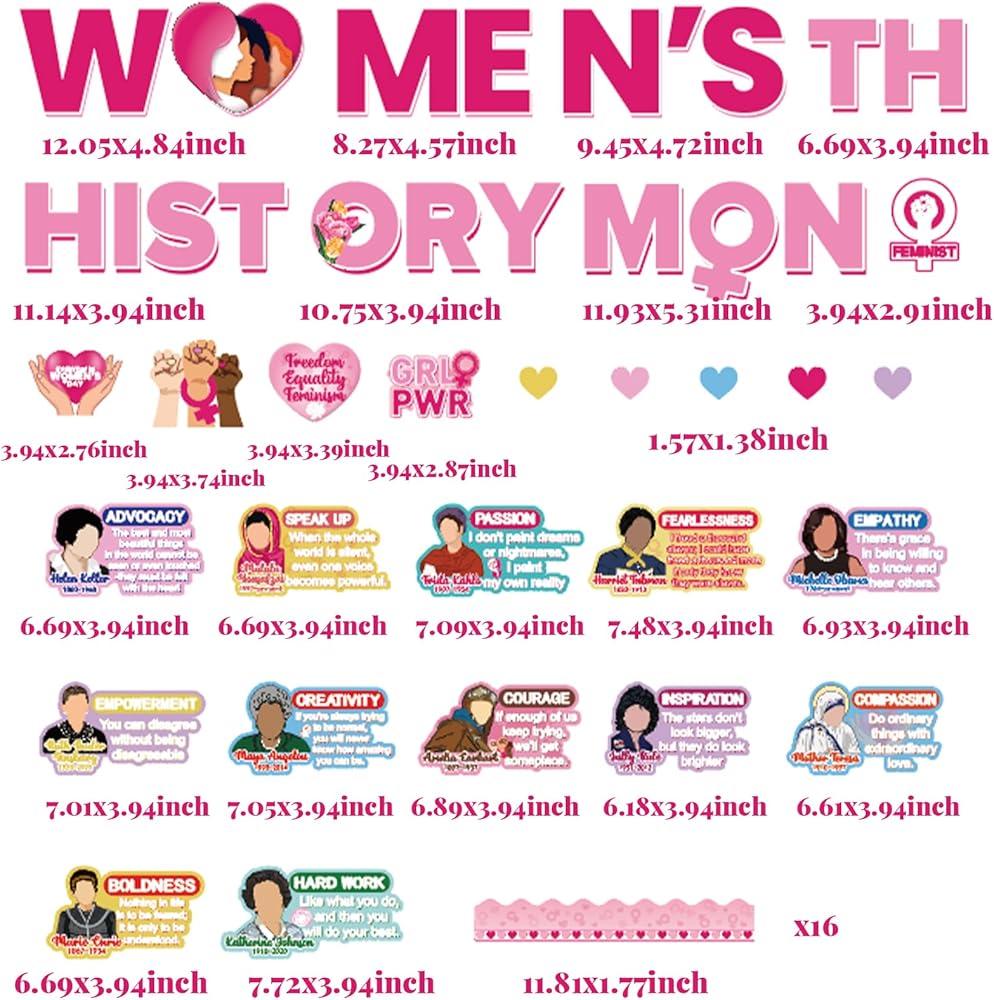 package includes: this women history month decorations package includes 11 pieces of womens inspirational quotes posters pattern cutouts 15 pcs women's history month decorations cutouts and 16 pieces of black history bulletin borders, enough to meet your womens history month bulletin board decorations needs. the womens history month classroom decorations also comes with 4 sheets of glue points for easy application