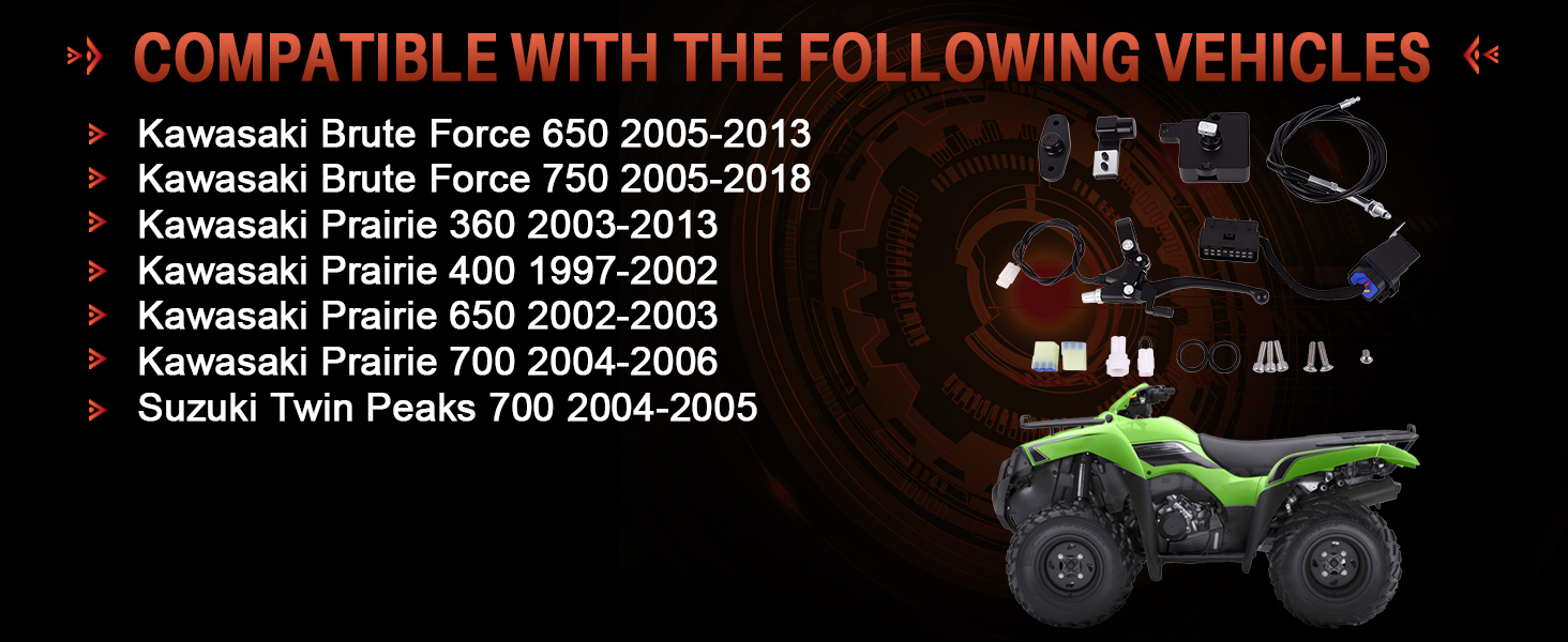المركبات المتوافقة: متوافقة مع Kawasaki Brute Force 650 2005-2013، Brute Force 750 2005-2018، Prairie 360 2003-2013، Prairie 400 1997-2002، Prairie 650 2002-2003، Prairie 700 2004-2006؛ متوافق مع سوزوكي توين بيكس 700 2004-2005