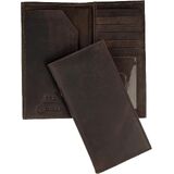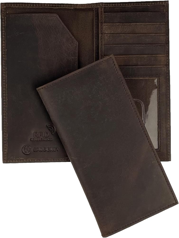 A high quality, genuine 100% cowhide leather rodeo wallet with a natural texture that will look and feel softer and more comfortable the more you use it. Advanced RFID blocking technology prevents unauthorized scans of credit cards. Features 5 credit card slots, 3 currency pockets, and a clear ID holder with thumb slot for easy removal of ID card. Imported. Package includes: 1 x Genuine Leather Checkbook wallet measuring 3.25" x 6.5" and a Gift Box with Logo.