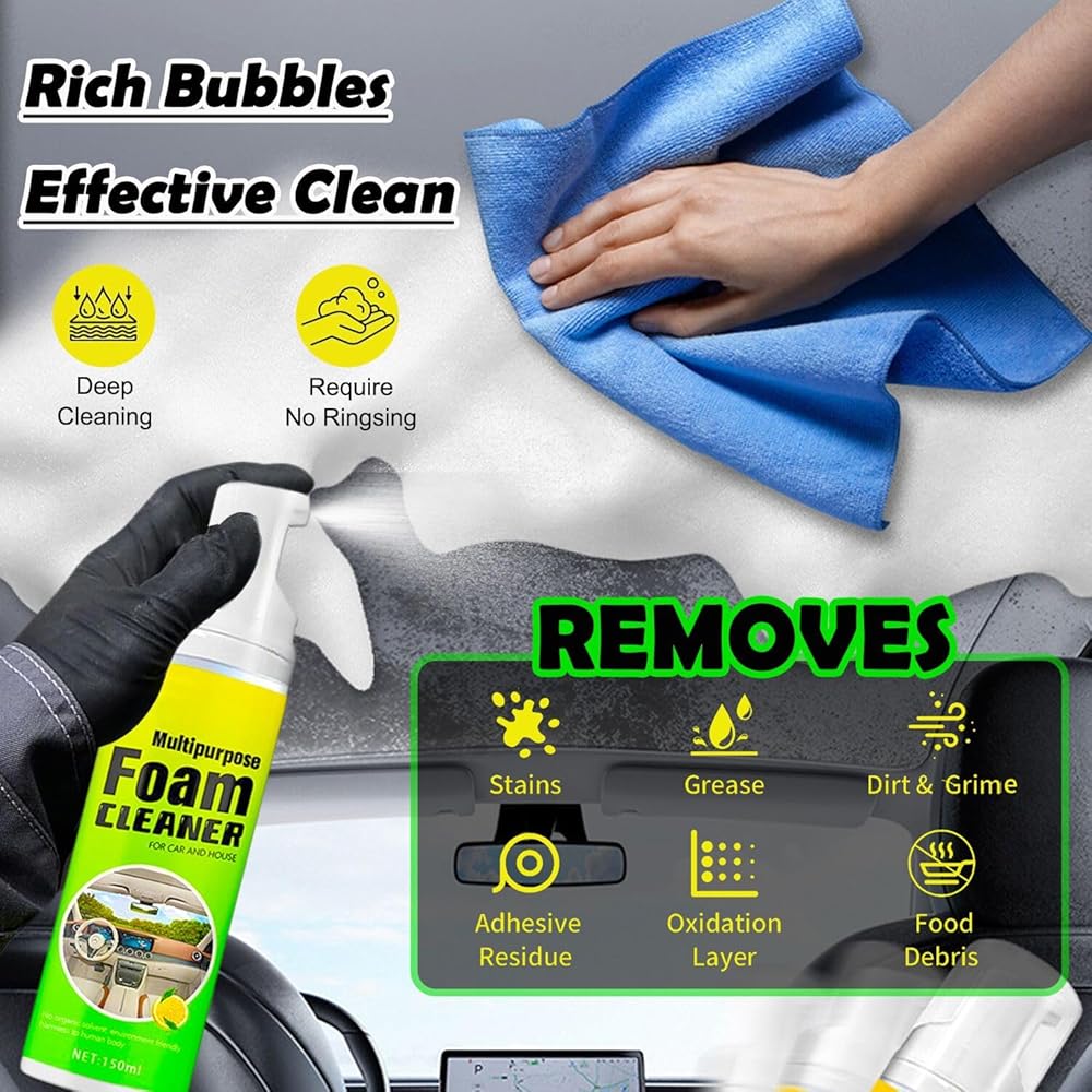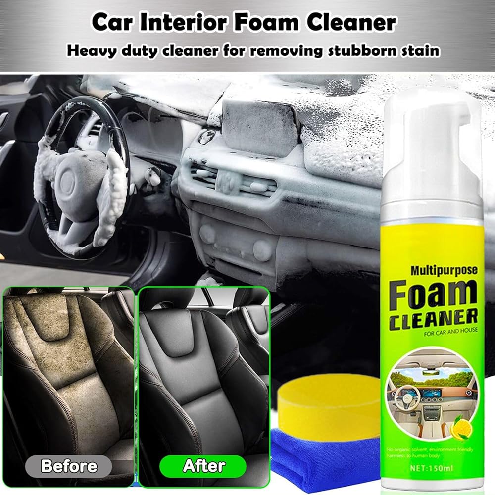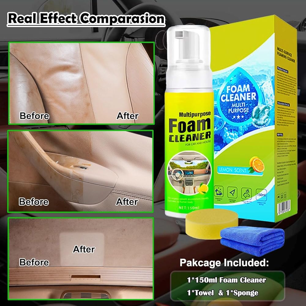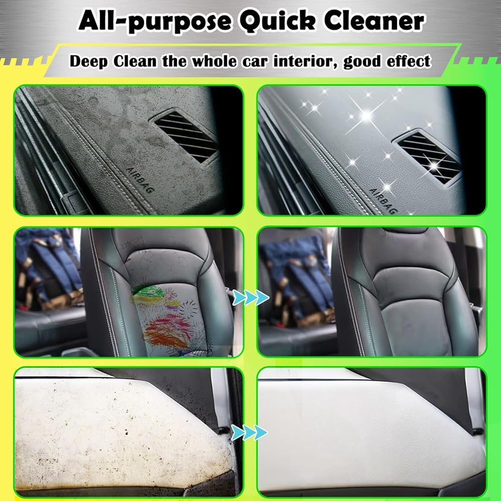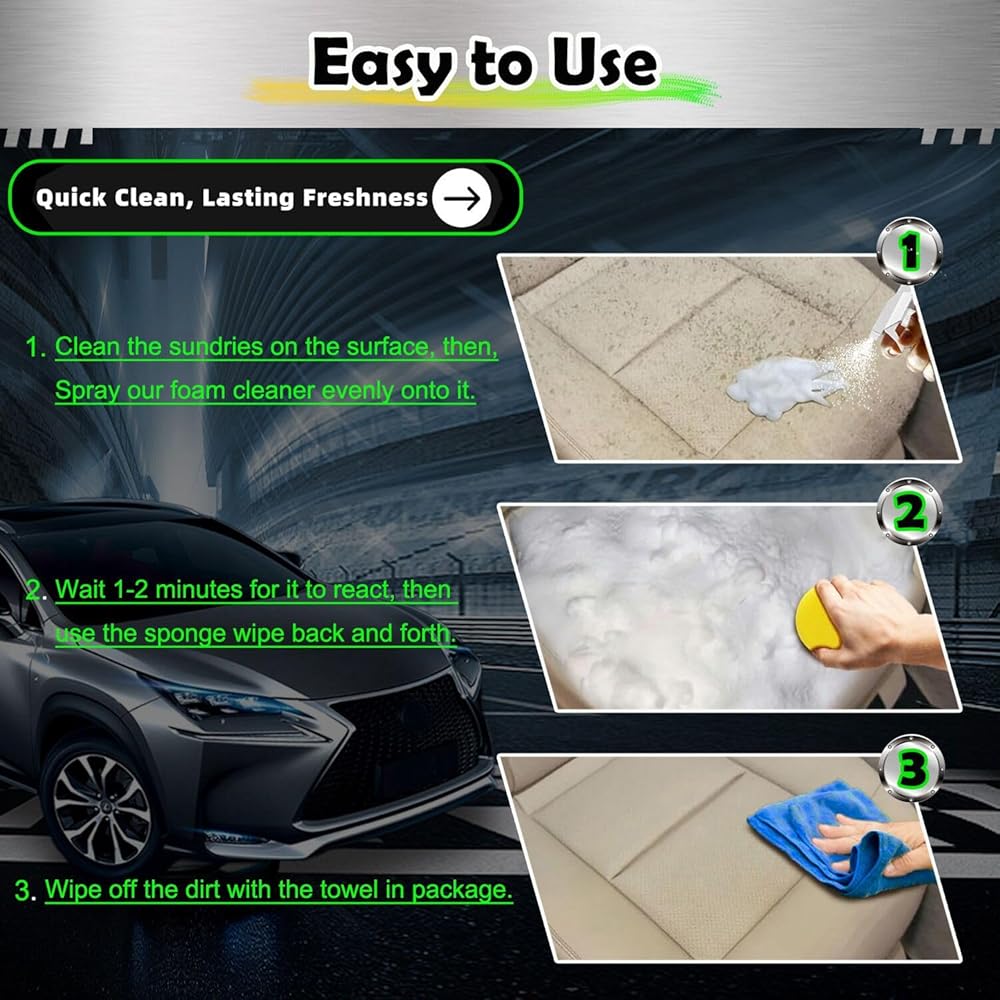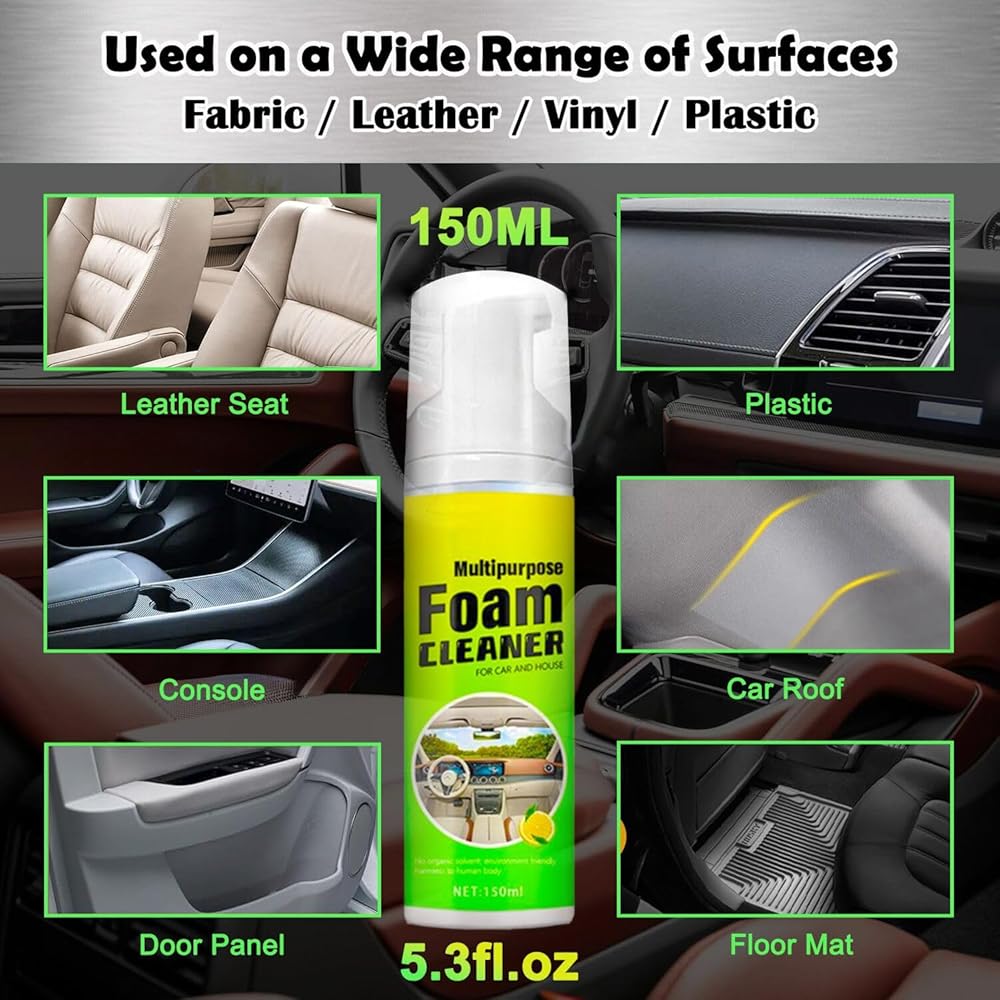 [سهل الاستخدام] منظف رغوي متعدد الأغراض، ما عليك سوى رش منظف السيارة الرغوي متعدد الأغراض مباشرة على المنطقة المرغوبة. انتظر لمدة 1-2 دقيقة للتفاعل، ثم افرك بمنشفة أو إسفنجة حتى تتم إزالة البقع، ولا حاجة للشطف. ما عليك سوى مسح الرغوة بمنشفة بعد التنظيف. قل وداعًا لمهام التنظيف الشاقة ووفر نفقات تنظيف سيارتك! منظف جلد الفينيل الداخلي للسيارة هذا هو مجموعة تفاصيل سيارتك الكاملة.