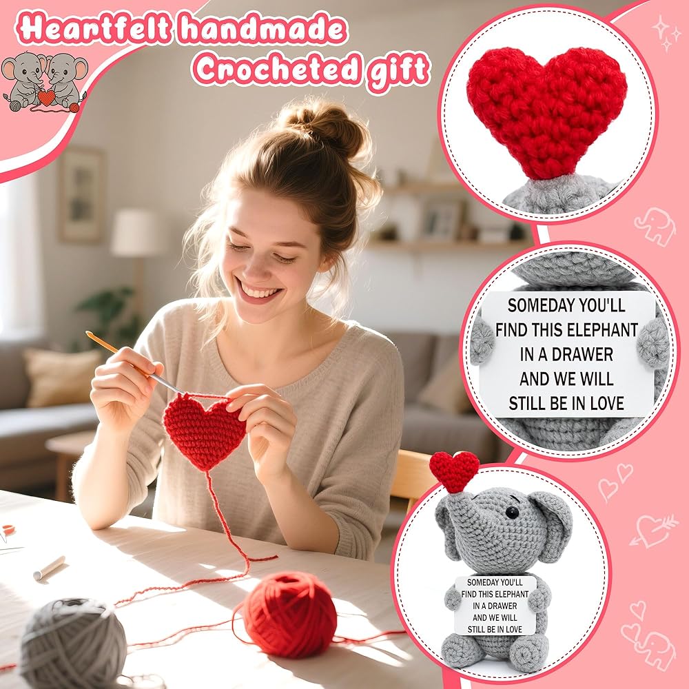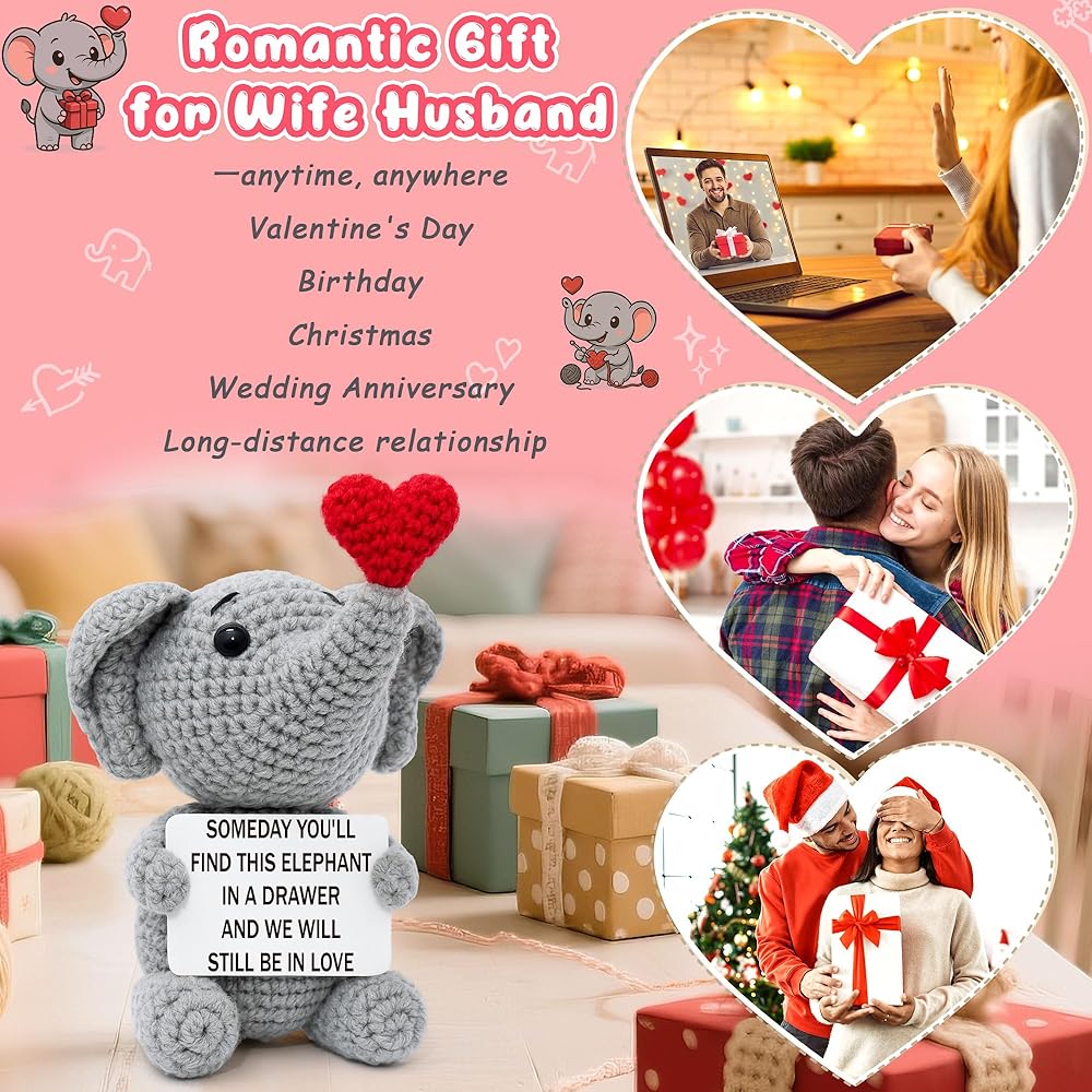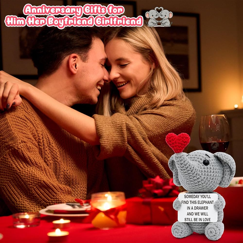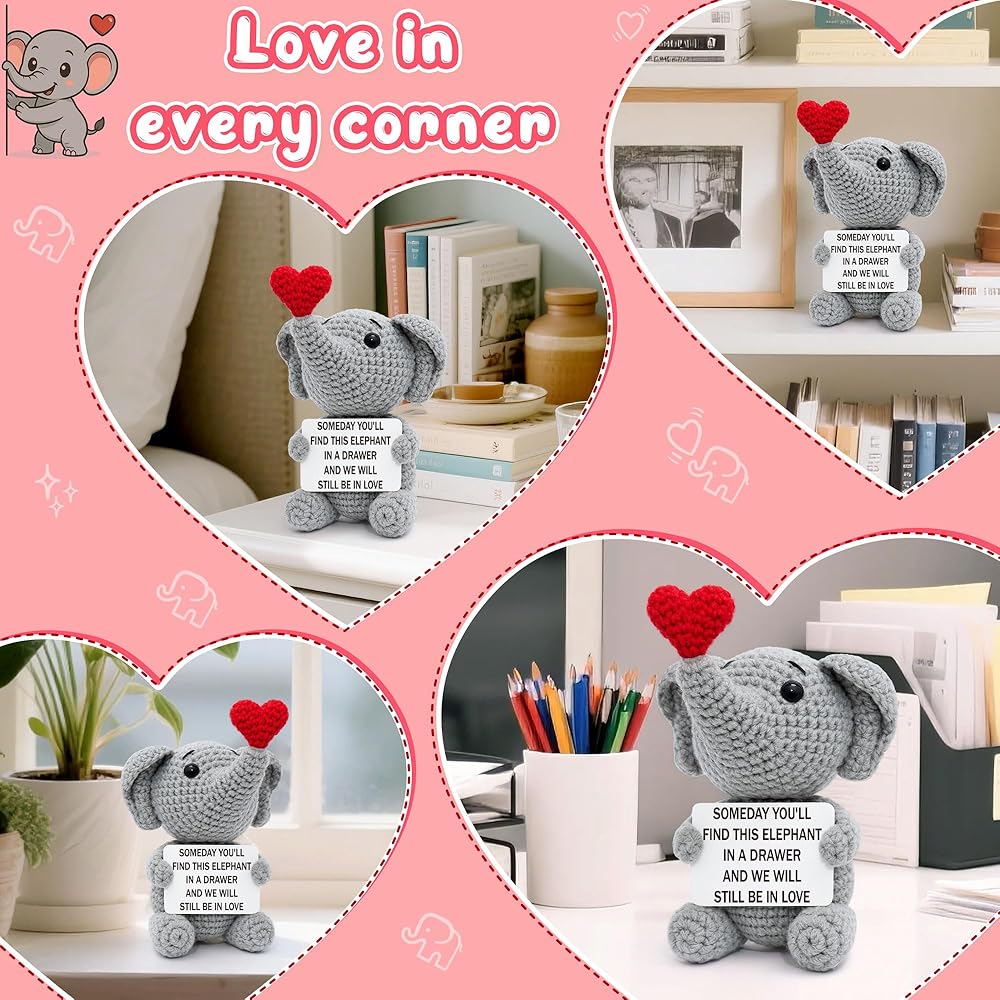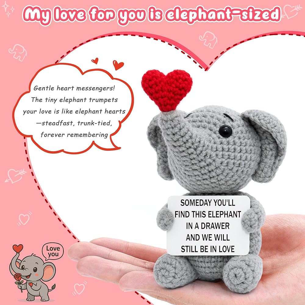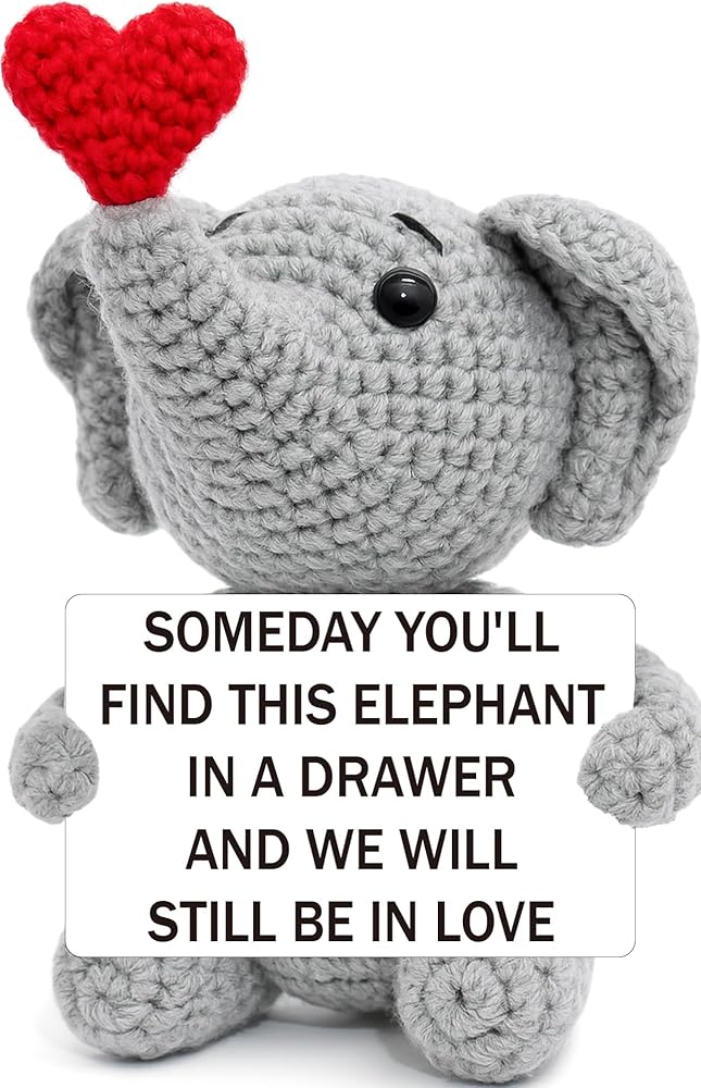 Looking for a gift that speaks of a love that lasts forever? This handmade crochet elephant is a beautiful and sentimental promise for the future. The charming card doesn't just say "I love you" for today; it looks ahead, declaring, "Someday you'll find this elephant in a drawer and we will still be in love." It's the ultimate romantic gift for your husband, wife, boyfriend, or girlfriend, perfect for celebrating an anniversary, Valentine's Day, or a birthday. More than just a gift, it's a lasting memento they can display on their desk or shelf, a daily, cheerful reminder of your enduring bond. Skip the fleeting gifts and give a sentimental keepsake that truly captures the timeless, "an elephant never forgets" nature of your love. This charming creation is perfect for both men and women, a true testament to a love story that will stand the test of time.
