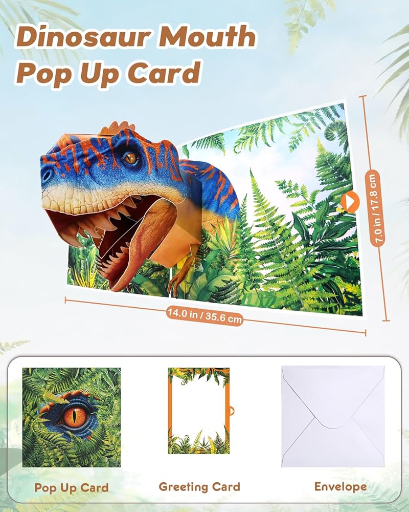 تأثير منبثق ثلاثي الأبعاد مذهل: استعد لمفاجأة مبهجة! عند فتحها، تكشف هذه البطاقة عن تي ريكس ثلاثي الأبعاد نابض بالحياة والذي يبدو وكأنه يقفز مباشرة من الصفحة. يضمن التصميم المعقد المقطوع بالليزر تجربة مذهلة بصريًا لا تُنسى للمتلقي