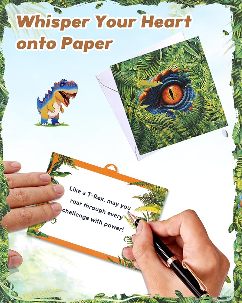 تصميم الديناصورات الملحمي: اجعل عالم ما قبل التاريخ ينبض بالحياة مع تصميم الديناصورات الملحمي هذا! تتميز بطاقة التهنئة هذه بوجود تي ريكس الهادر الذي يخرج من أوراق الشجر الكثيفة في الغابة، وهي خيار مثالي لعشاق الديناصورات من جميع الأعمار. الألوان الزاهية والتفاصيل النابضة بالحياة تجعلها لا تُنسى حقًا