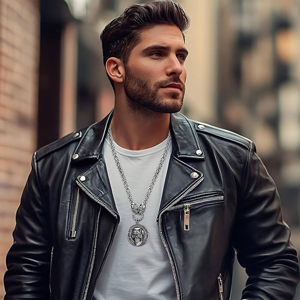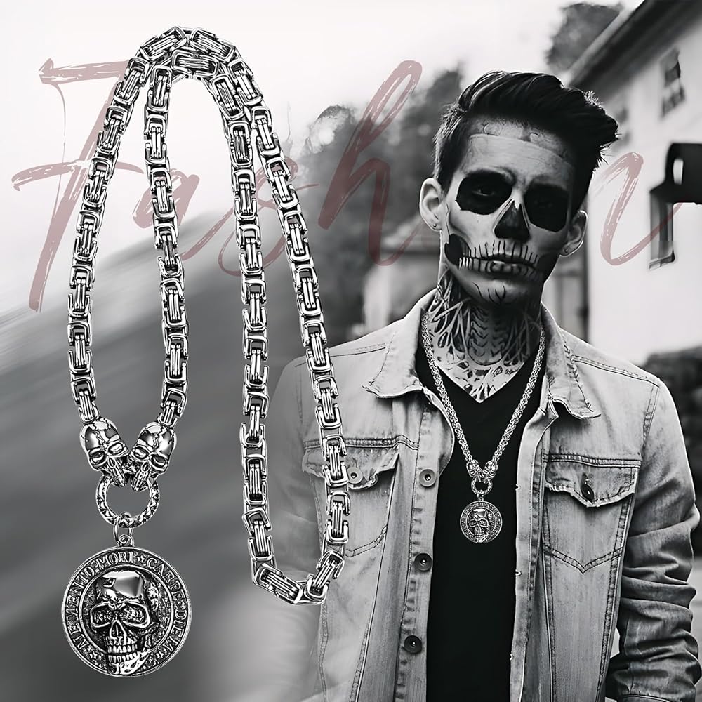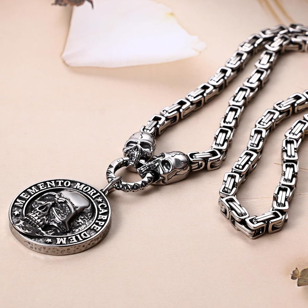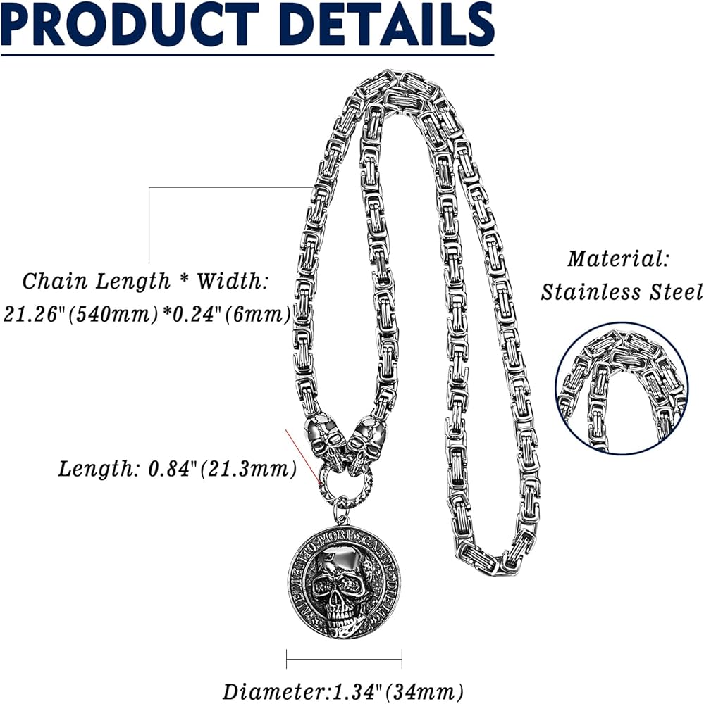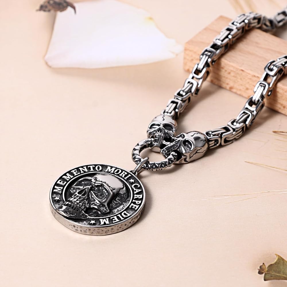 قلادة جمجمة Aroncent Memento Mori: قلادة عملة قوطية من الفولاذ المقاوم للصدأ مجوهرات للجنسين إيطالية وهندية منقوشة - سلسلة بيزنطية 21.26 بوصة قابلة للتعديل