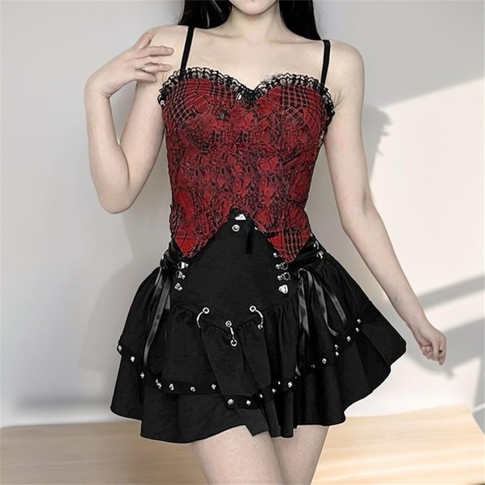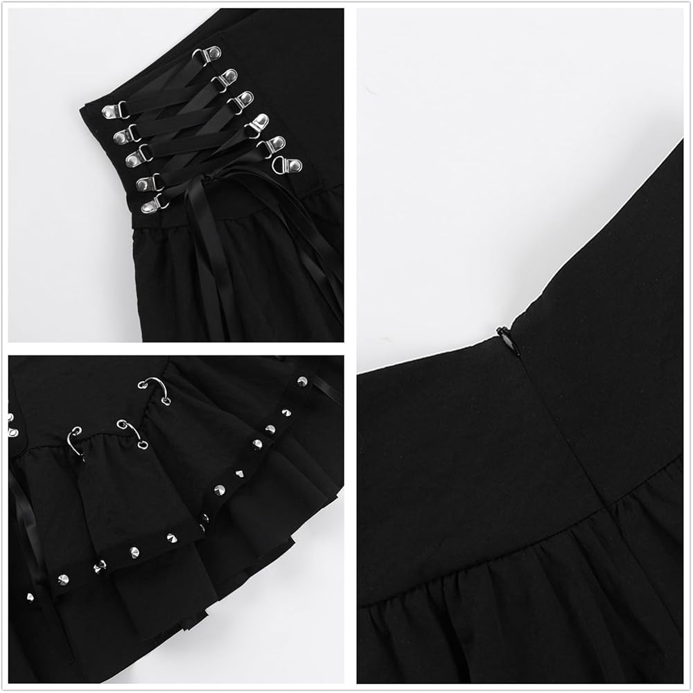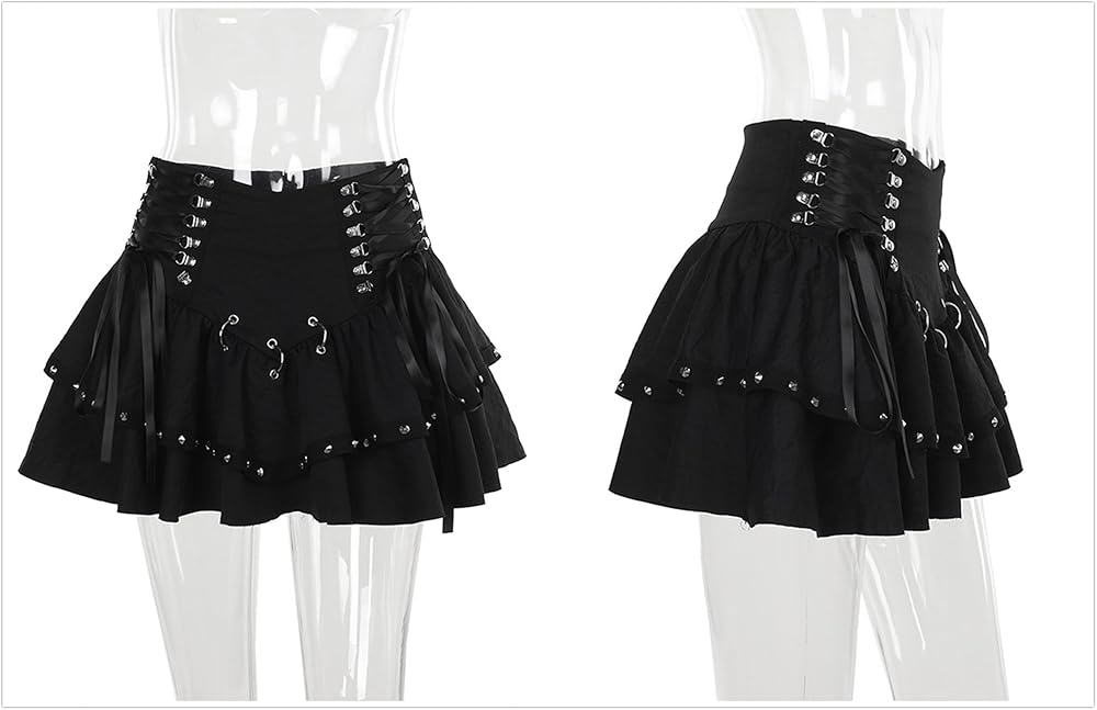 تفاصيل فريدة: مستوحاة من تنورة القرون الوسطى وأجواء التنورة البخارية، تتضمن هذه التنورة القصيرة ذات الطبقات المزدوجة أجواء مكشكشة ورباط أمامي، مما يوفر سحر تنورة ساحرة مثالية لعشاق التنورة البديلة أو موضوعات تنورة مصاصي الدماء