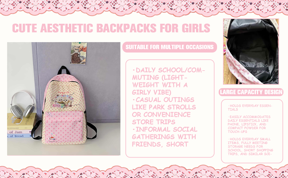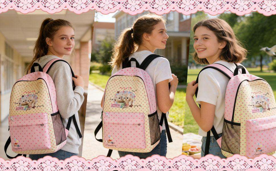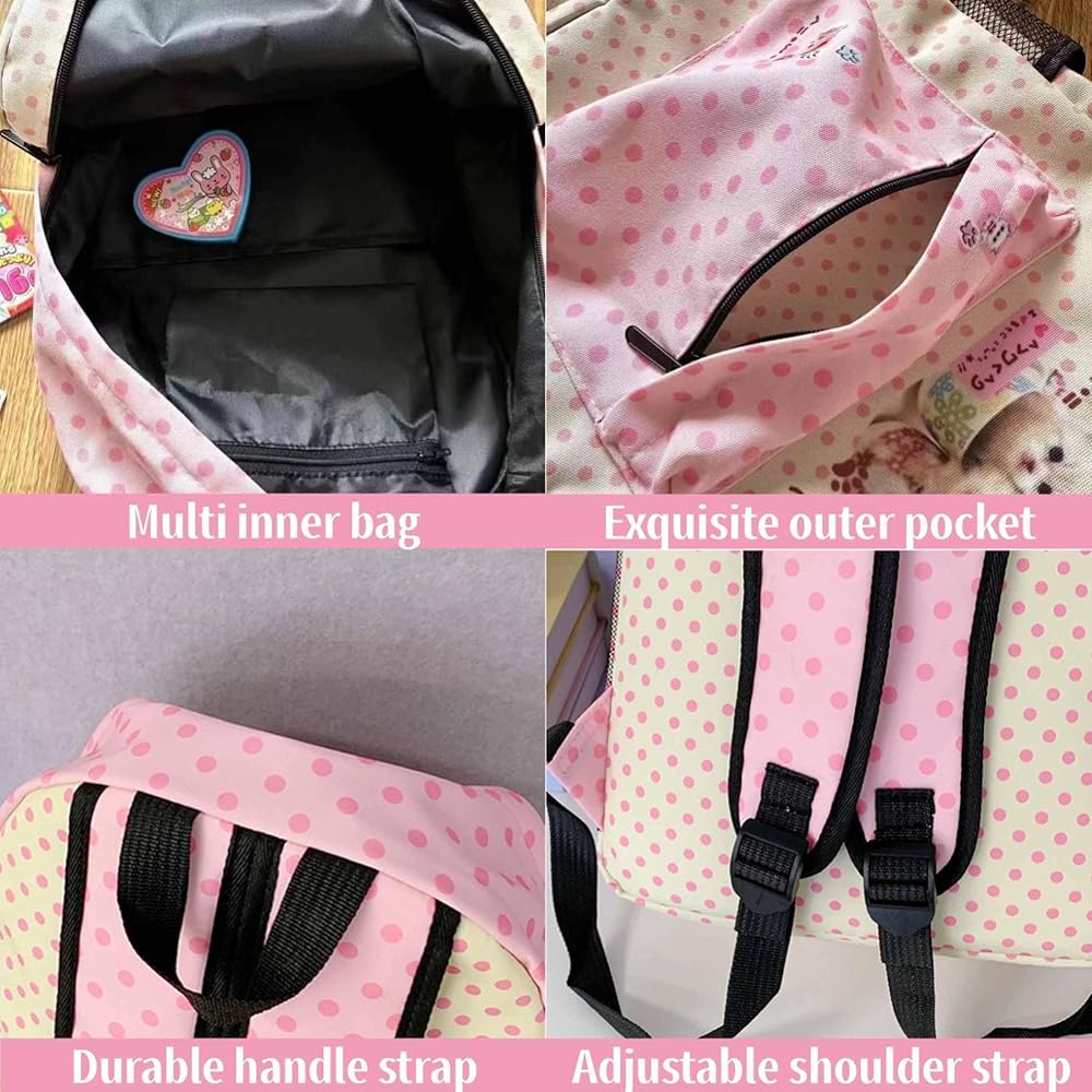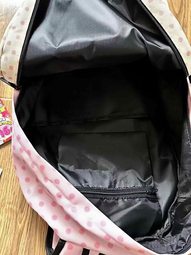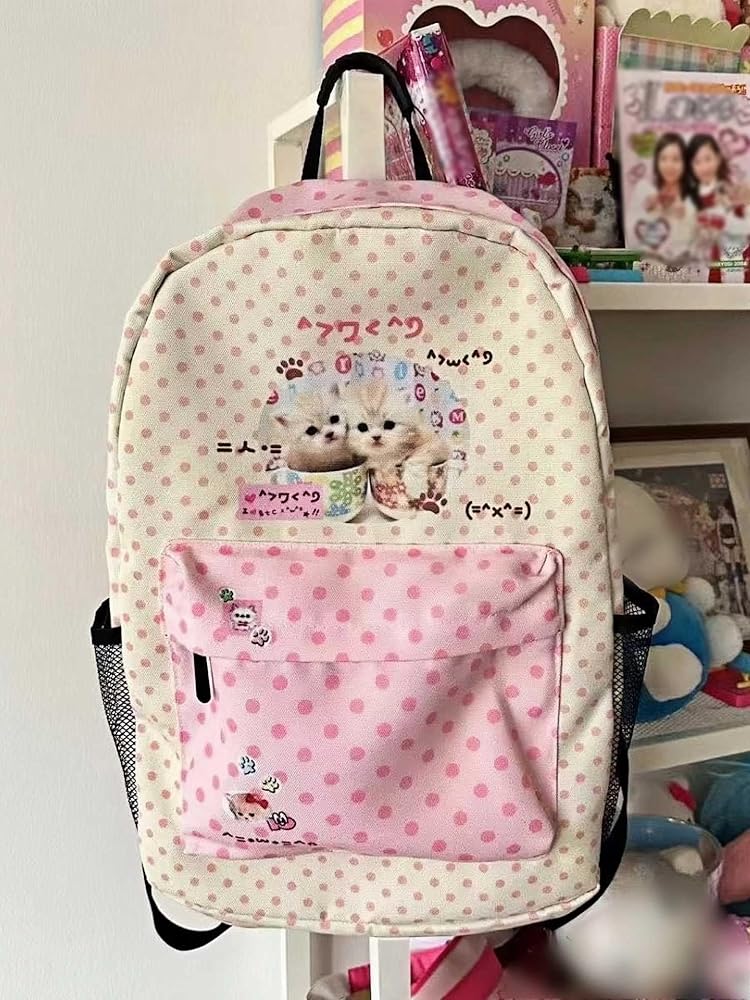 - التصميم: حقيبة ظهر رائعة بطباعة قطة تتميز بنمط منقط جميل بألوان وردية وكريمية مع رسومات على طراز كاواي