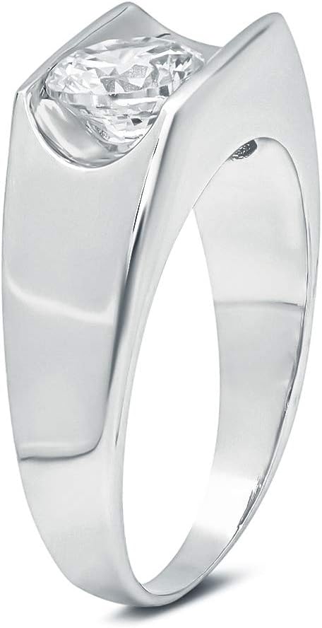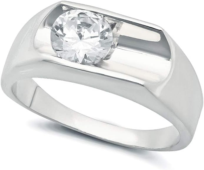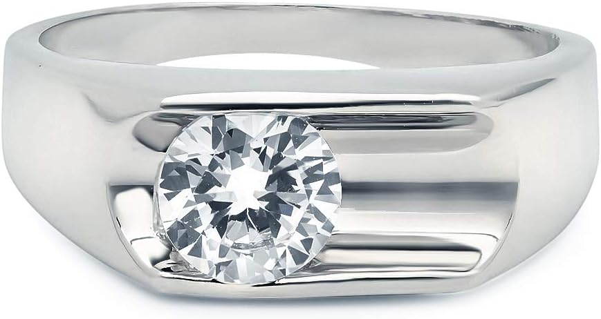 Taking inspiration from big and bold classic design, this lavish men's rhodium plated CZ solitaire ring features a large CZ solitaire in a unique bezel setting. Both made and designed in America, this large (.66”) 17mm ring is designed for maximum impact. Featuring a heavy brass core, it looks and feels just like a real solid platinum ring, all at a price that's right. Lifetime Replacement Warranty. Rhodium Overlay, Cubic Zirconia stone.