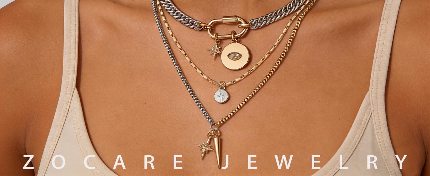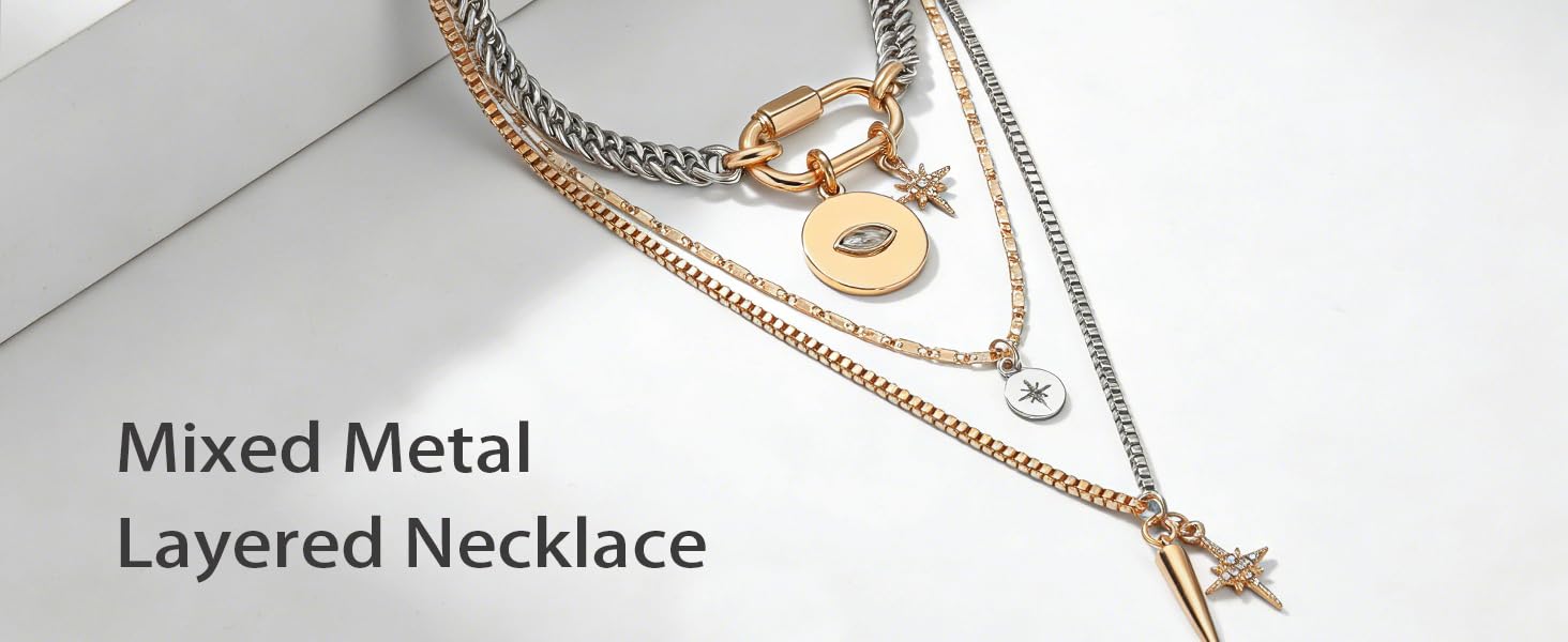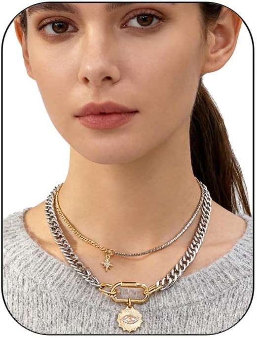 القلادة الذهبية والفضية: - تتميز بتشطيبات ذهبية وفضية ومعدنية مختلطة مع سحر العين الشريرة والانفجار النجمي والقرص والمعلقات الهندسية. يجمع بين سلسلة فضية مكتنزة مع حلقة مشبك جبلي، وأنماط العملات المعدنية للحصول على مظهر عصري ومتعدد الاستخدامات.