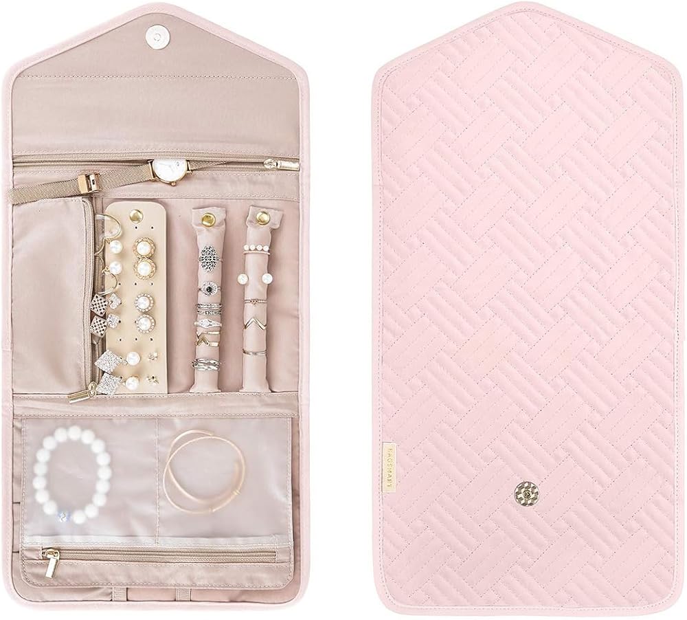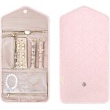 Effortlessly organize and protect your jewelry while traveling with this versatile travel jewelry case. Featuring a sleek quilted design, the compact case offers ample storage space with multiple compartments and pockets to neatly hold your necklaces, bracelets, rings, and earrings. The soft lining ensures your precious pieces remain scratch-free, while the zippered closure keeps everything securely in place. The included pouch provides additional storage for smaller items. Lightweight and portable, this travel jewelry organizer is an essential companion for any trip, allowing you to bring your favorite accessories without the hassle of tangled chains or misplaced earrings. Available in classic black or a stylish blush shade, this case combines functionality with a touch of elegance.
