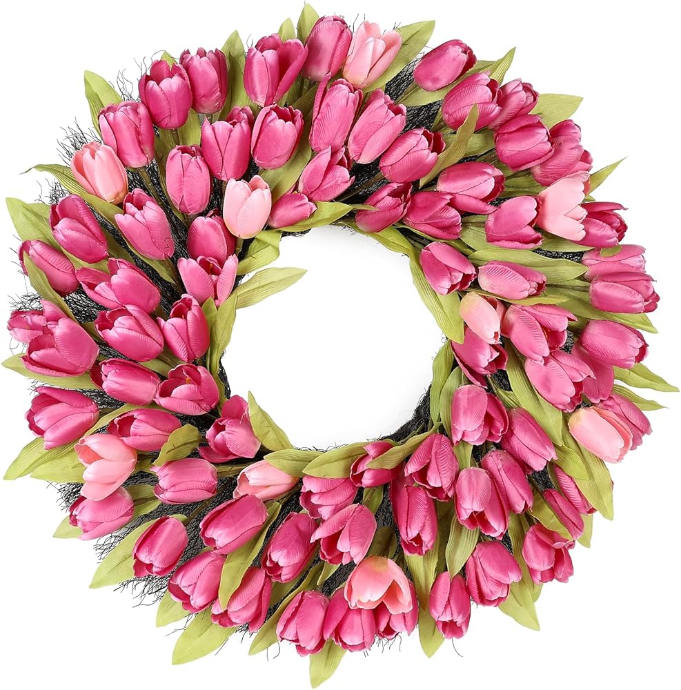 • ④ 【Realistic & Stylish Design】: Crafted with a faux vine base and filled with vibrant pink and purple artificial tulips alongside green leaves, this elegant and cheerful wreath serves beautifully as a spring wreath and summer wreath.
