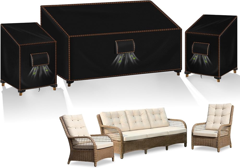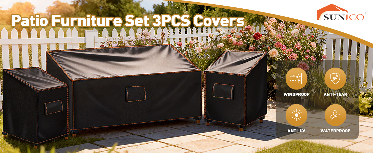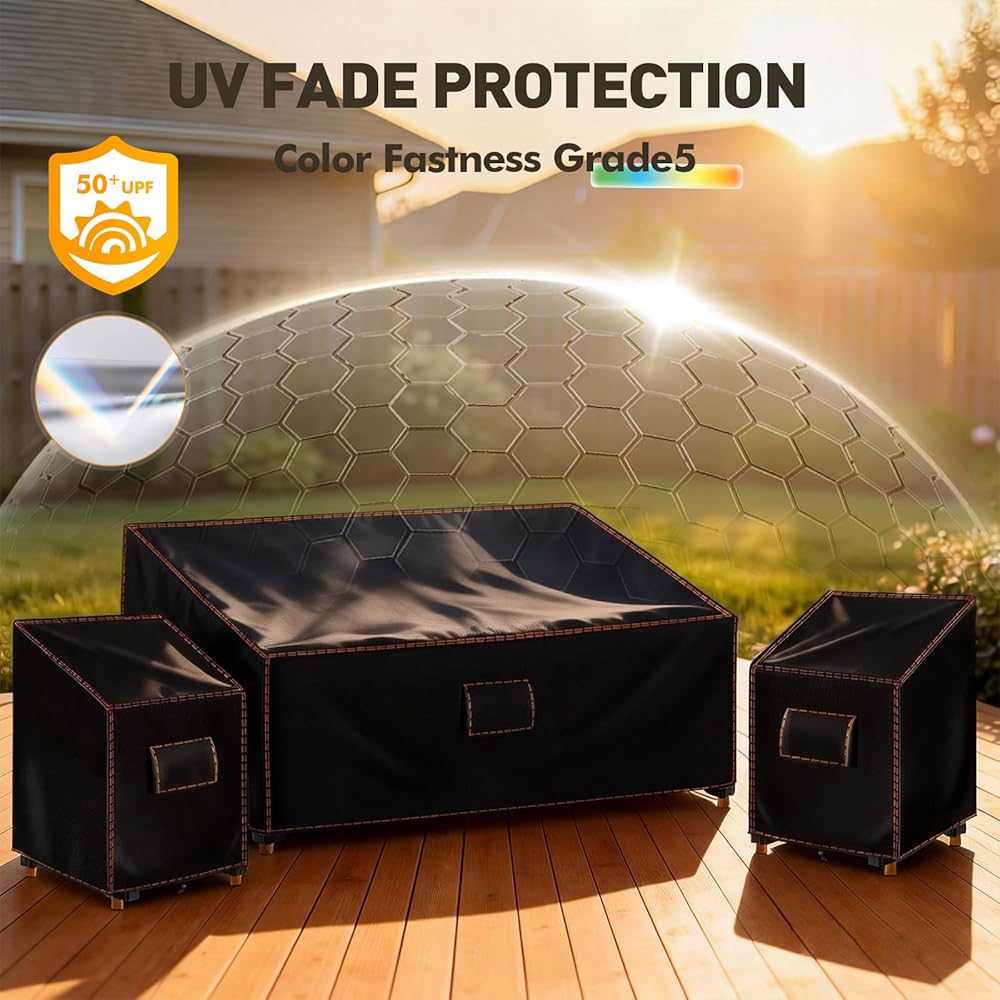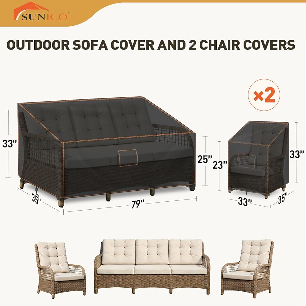 【3 قطع أغطية مجموعة الفناء】تشتمل أغطية الأثاث الخارجي هذه على غطاء أريكة خارجي بقياس 79 بوصة عرض × 35 بوصة عمق × 33 بوصة ارتفاع وغطاءين للكرسي الخارجي مقاس 32 بوصة عرض × 35 بوصة عمق × 33 بوصة ارتفاع، مما يضمن التغطية الكاملة لمجموعة الأثاث الخاصة بك
