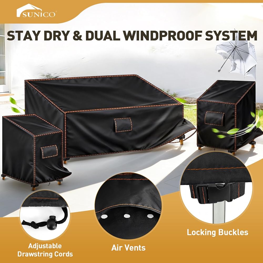 【نظام حماية ثلاثي من الرياح】يحمي غطاء أثاث الفناء الخارجي الخاص بنا بثلاث طرق: من خلال رباط الحاشية لملاءمة محكمة، وأربعة أشرطة نقر لتثبيت آمن، وتعزيزات جانبية مثلثة لتحقيق أقصى قدر من الثبات - مما يبقيه في مكانه بشكل آمن حتى في العواصف.