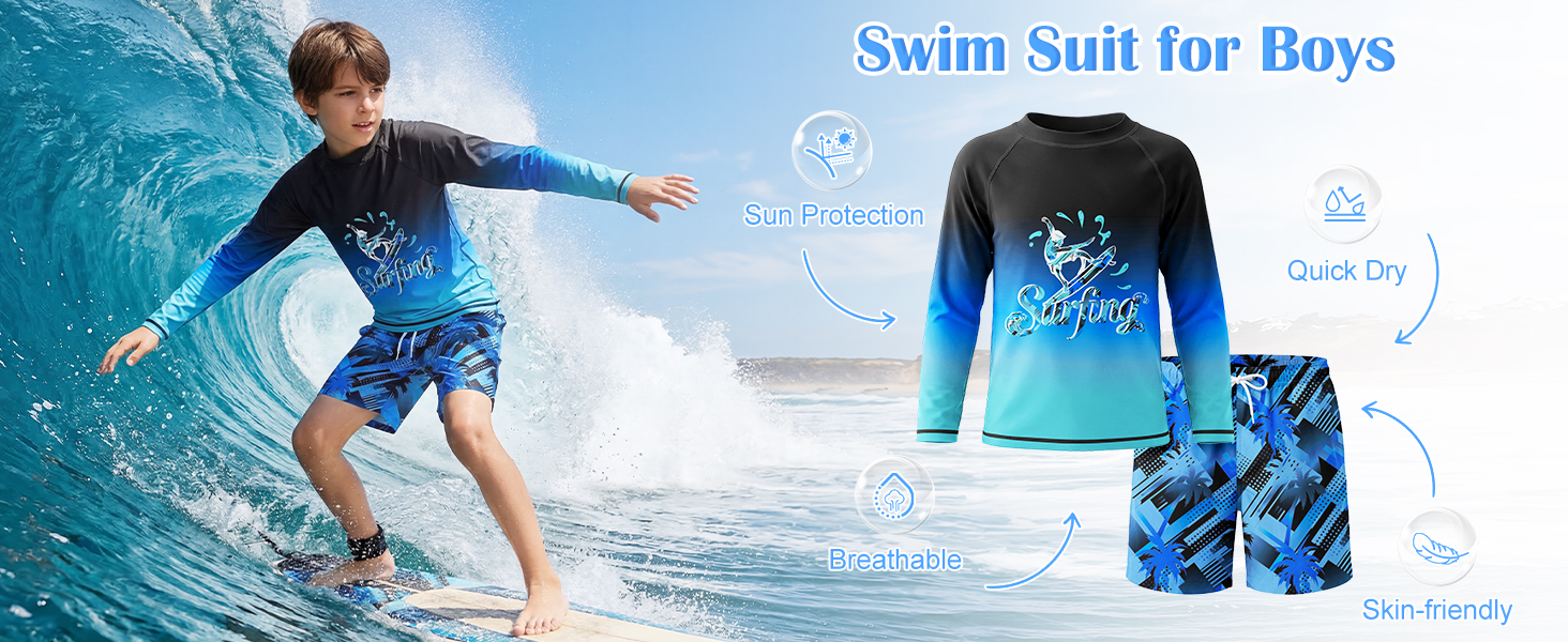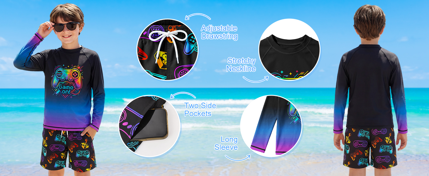 الحماية من الشمس: تتميز مجموعات ملابس السباحة للأولاد بمؤشر حماية من الأشعة فوق البنفسجية بعامل حماية من الأشعة فوق البنفسجية 50+، وتوفر الأكمام الطويلة تغطية إضافية وحماية من الشمس، والتي يمكنها مقاومة الأشعة فوق البنفسجية بشكل فعال وحماية البشرة من التلف. دع أطفالك يستمتعون بإجازة مرحة وخالية من الهموم