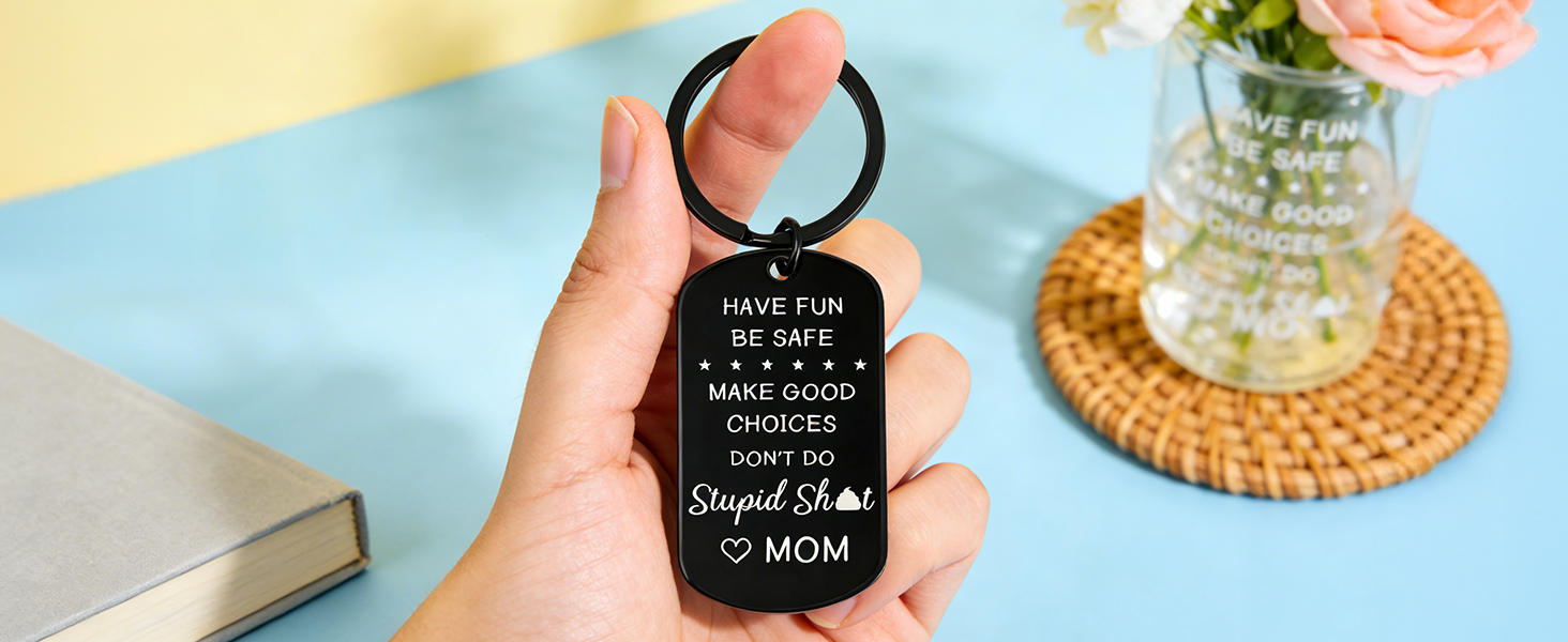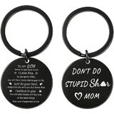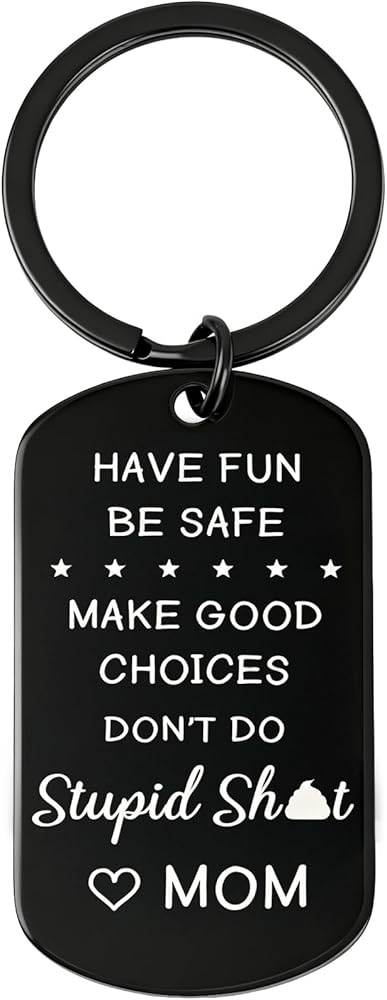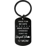 سلسلة مفاتيح مرحة: سلسلة المفاتيح المخصصة للمراهقين منقوشة بكلمات مضحكة وملهمة لابنتك وابنك، مكتوب عليها "استمتع، كن آمنًا، قم باختيارات جيدة. لا تفعل شيئًا غبيًا. Love Mom" سلسلة المفاتيح المنقوشة هي "رسالة حب" فريدة يمكن حملها في أي مكان لإظهار حبك واهتمامك بالمراهقين