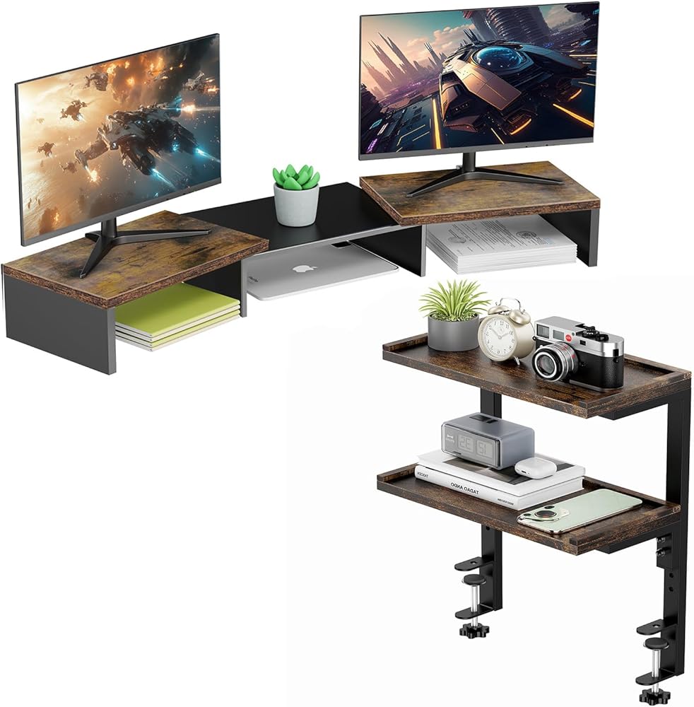 OUTIOE Dual Monitor Stand + 2-Tier Desk Shelf (Wood)