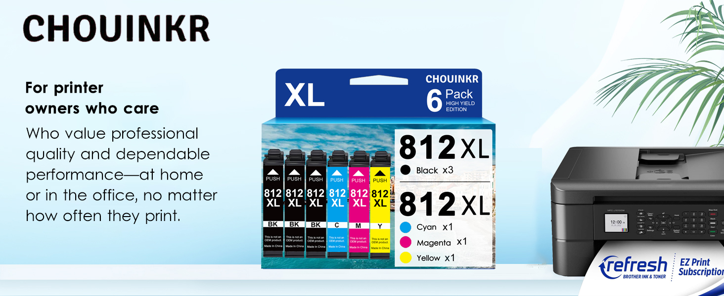 - محتوى العبوة: 3 × 812XL أسود، 1 × 812XL سماوي، 1 × 812XL أرجواني، 1 × 812XL أصفر، 1 × دليل المستخدم (خراطيش غير OEM)