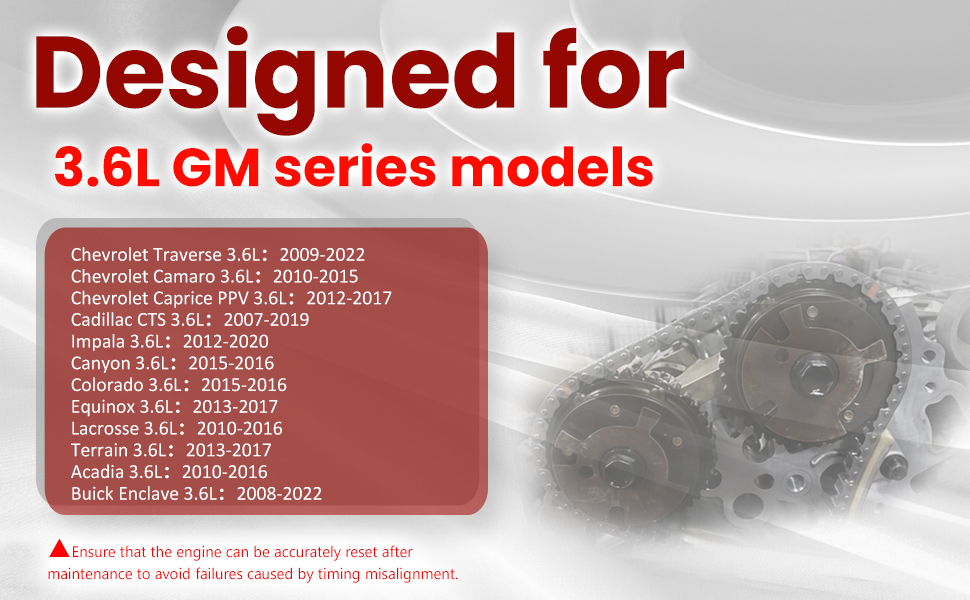 متوافق مع: EN-48313-1 مصمم لموديلات سلسلة GM 3.6L، بما في ذلك كاديلاك، وبويك، وساترن، وبونتياك، وشفروليه وغيرها من العلامات التجارية، التي تغطي كامارو، وإمبالا، وكانيون، وكولورادو، وإكوينوكس، ولاكروس، وترين، وأكاديا، وإنكليف، وترافيرس، وCTS ونماذج أخرى لتلبية احتياجات الصيانة الخاصة بك.