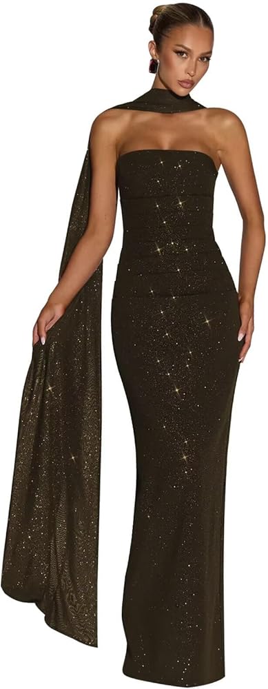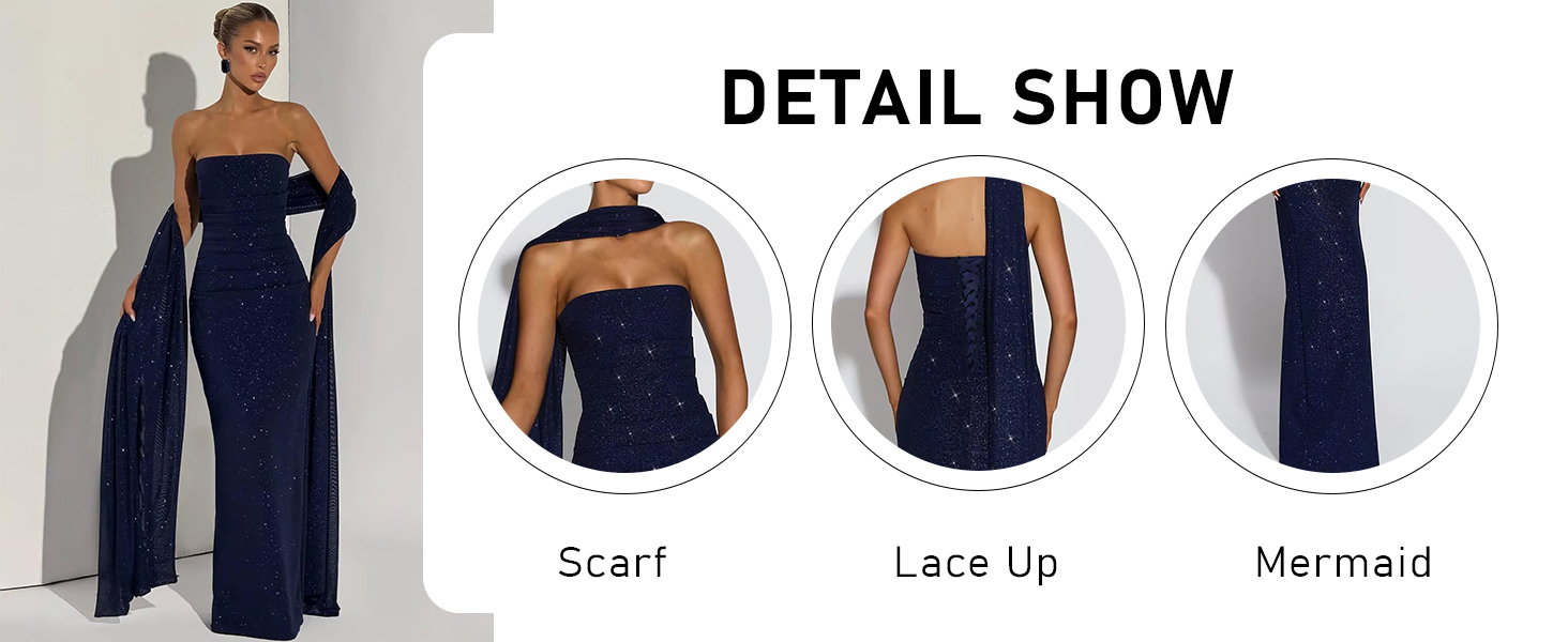 الميزات - فساتين حفلة موسيقية بدون حمالات للنساء، فساتين سهرة لامعة مع وشاح، فساتين حفلة موسيقية طويلة حورية البحر، فستان حفلات مسائية Bodycon، طول طويل، حمالة صدر مدمجة، مبطنة بالكامل. فساتين الحفلة اللامعة للنساء جميلة جدًا. فستان السهرة بدون حمالات هذا مناسب لكل لحظة مهمة في حياتك.