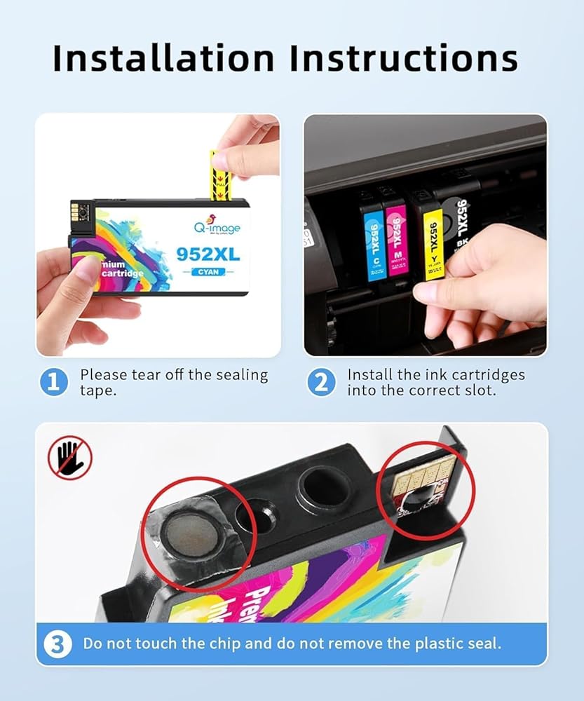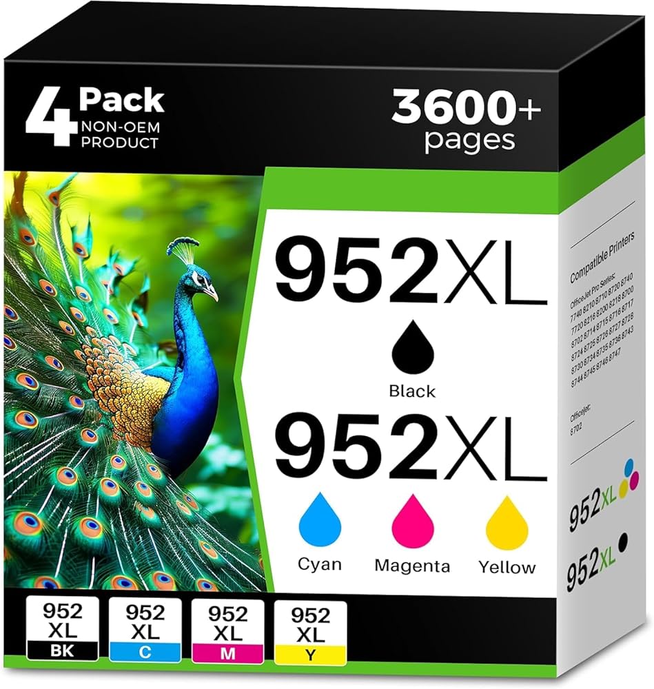 • محتويات العبوة: 1 × أسود 952XL، 1 × سماوي 952XL، 1 × أرجواني 952XL، 1 × أصفر 952XL، إجمالي 4 خراطيش 952xl