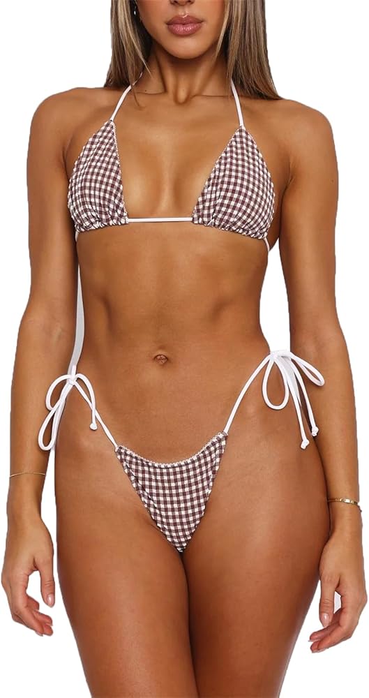VnimVinter Women Sexy Gingham Bikini Set Y2K Textured Plaid Halter Triangle Tie Side Cheeky Thong 2 Piece Bathing Suit