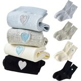 Add a touch of charm to your everyday comfort with these delightful heart-embroidered crew socks. Available in a versatile 4-color pack including classic white, sophisticated black, and soothing shades of gray, these socks feature an adorable embroidered heart detail that adds a subtle yet sweet accent to your footwear collection. Crafted from a soft cotton blend, these crew-length socks provide the perfect balance of breathability for all-day wear. The ribbed cuff ensures they stay perfectly in place without feeling too tight, while the medium thickness offers ideal cushioning for various activities. The classic crew length hits at mid-calf, making these socks suitable for pairing with any type of shoes from sneakers to boots. Whether you're heading to work, running errands, or just lounging at home, these charming socks bring both style and comfort to your everyday wardrobe. The neutral color selection ensures they complement any outfit, while the heart detail adds a playful element to your look.