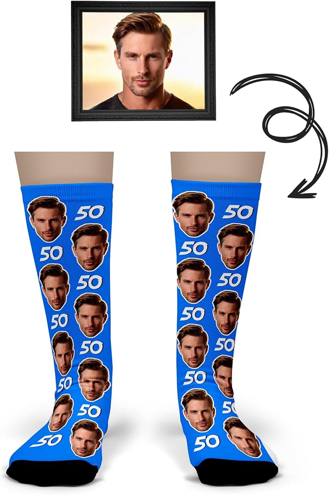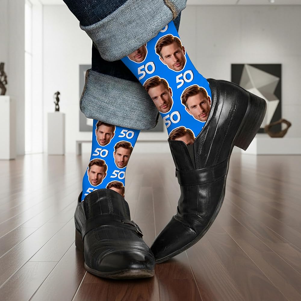 Celebrate any milestone in style with these personalized birthday socks featuring a face and custom age design. Simply click “Customize Now” to upload a clear photo and add the number you want displayed, whether it's 21, 30, 40, 50, or any other age. Made from soft, stretchy, and breathable material, these socks are comfortable to wear all day and built to last through countless celebrations. Perfect for milestone birthdays, anniversaries, family parties, or as a hilarious gag gift, these custom socks are guaranteed to bring laughs and make unforgettable memories. A fun and practical keepsake they'll actually use long after the party is over.
