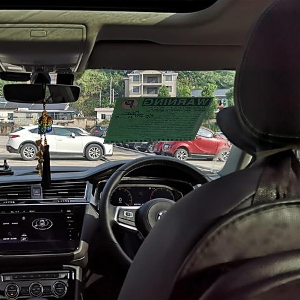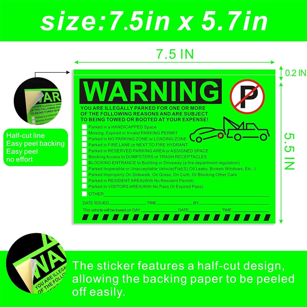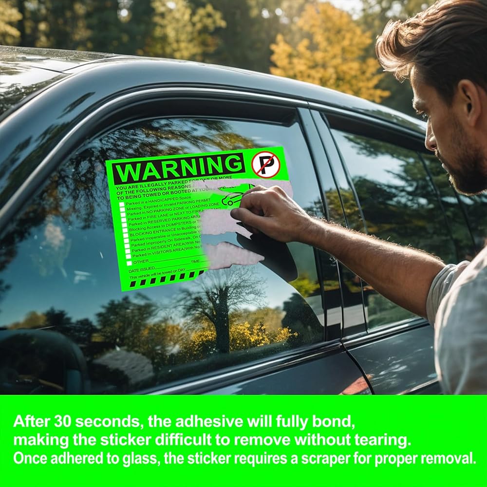 ملصقات تحذيرية لوقوف السيارات غير القانوني - إشعارات انتهاك مواقف السيارات باللون الأخضر النابض بالحياة - لاصق الصقها وانسىها - 50 قطعة من ملصقات انتهاك مواقف السيارات الخاصة لنوافذ السيارات - مقاس 5.5 × 7.5 بوصة.