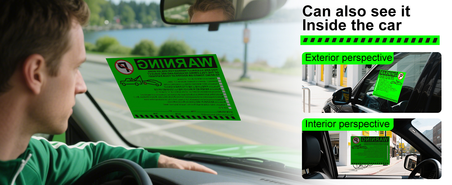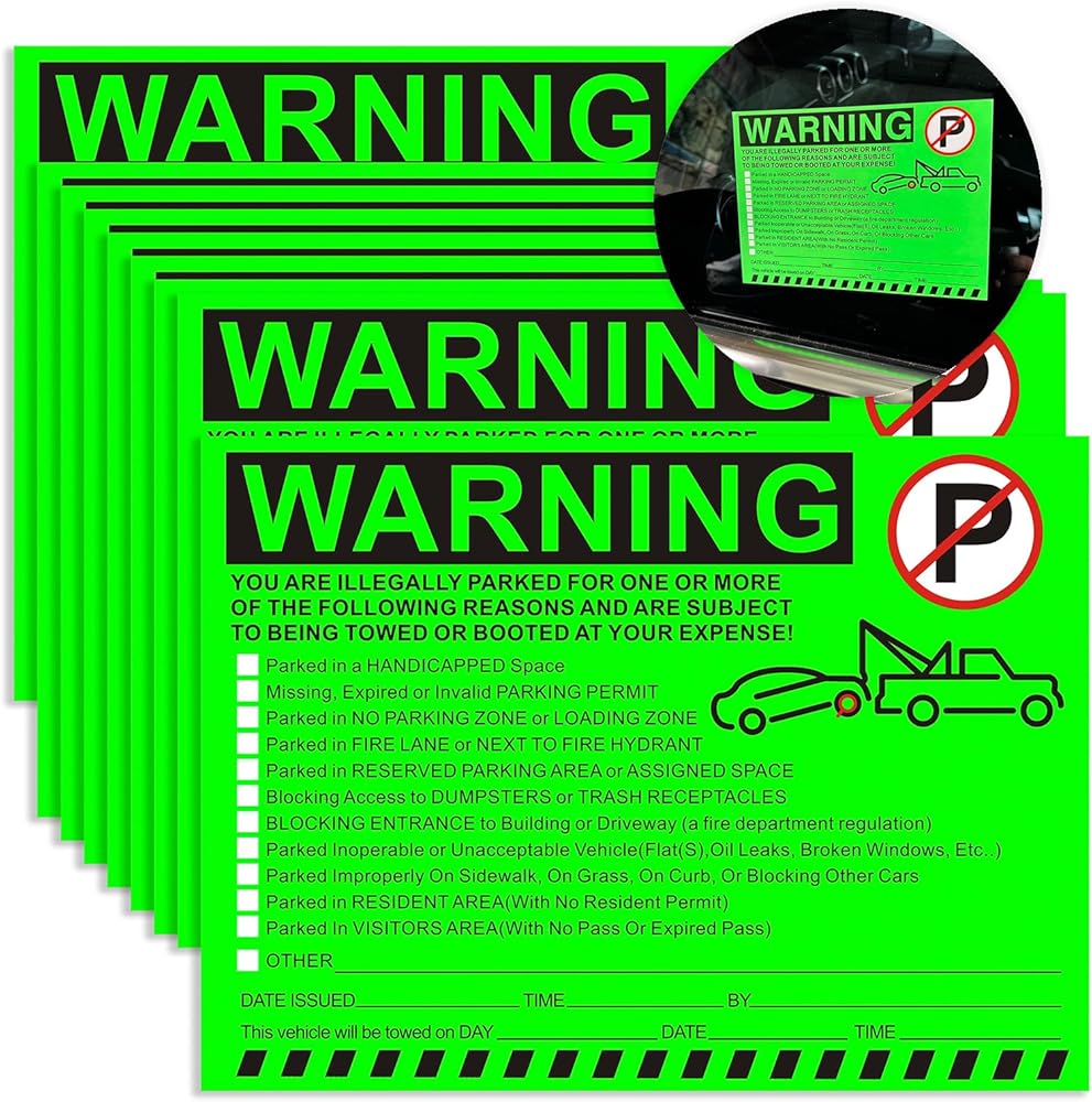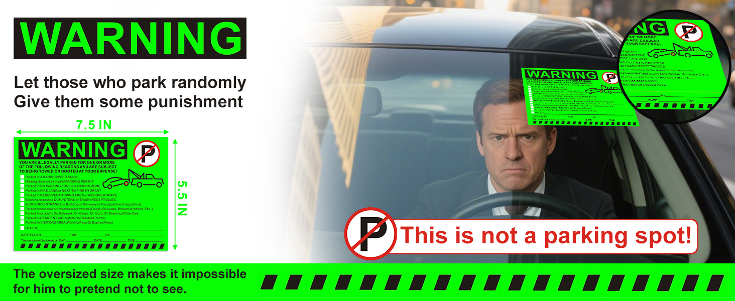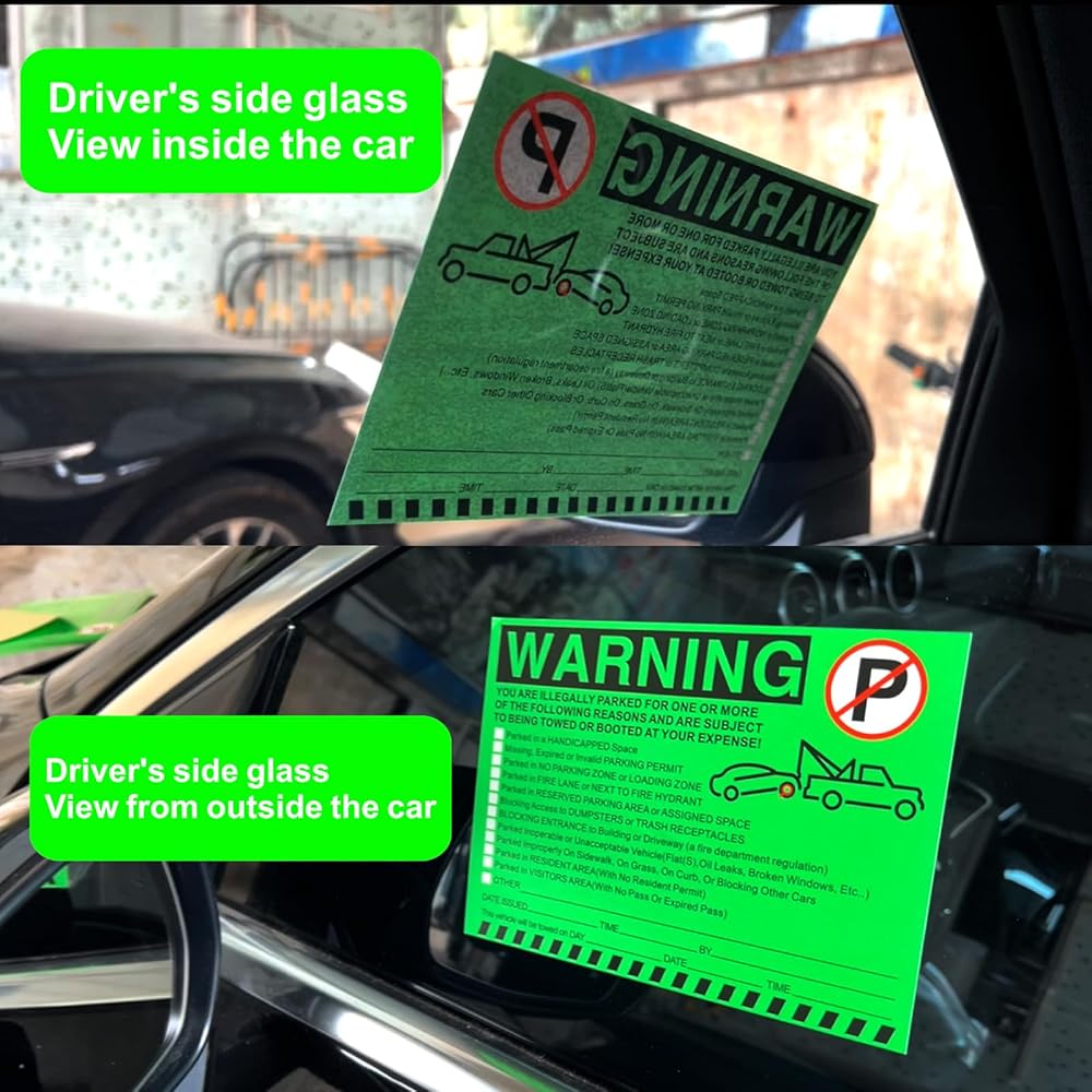 ملصقات تحذيرية لوقوف السيارات غير القانوني - إشعارات انتهاك مواقف السيارات باللون الأخضر النابض بالحياة - لاصق الصقها وانسىها - 50 قطعة من ملصقات انتهاك مواقف السيارات الخاصة لنوافذ السيارات - مقاس 5.5 × 7.5 بوصة.