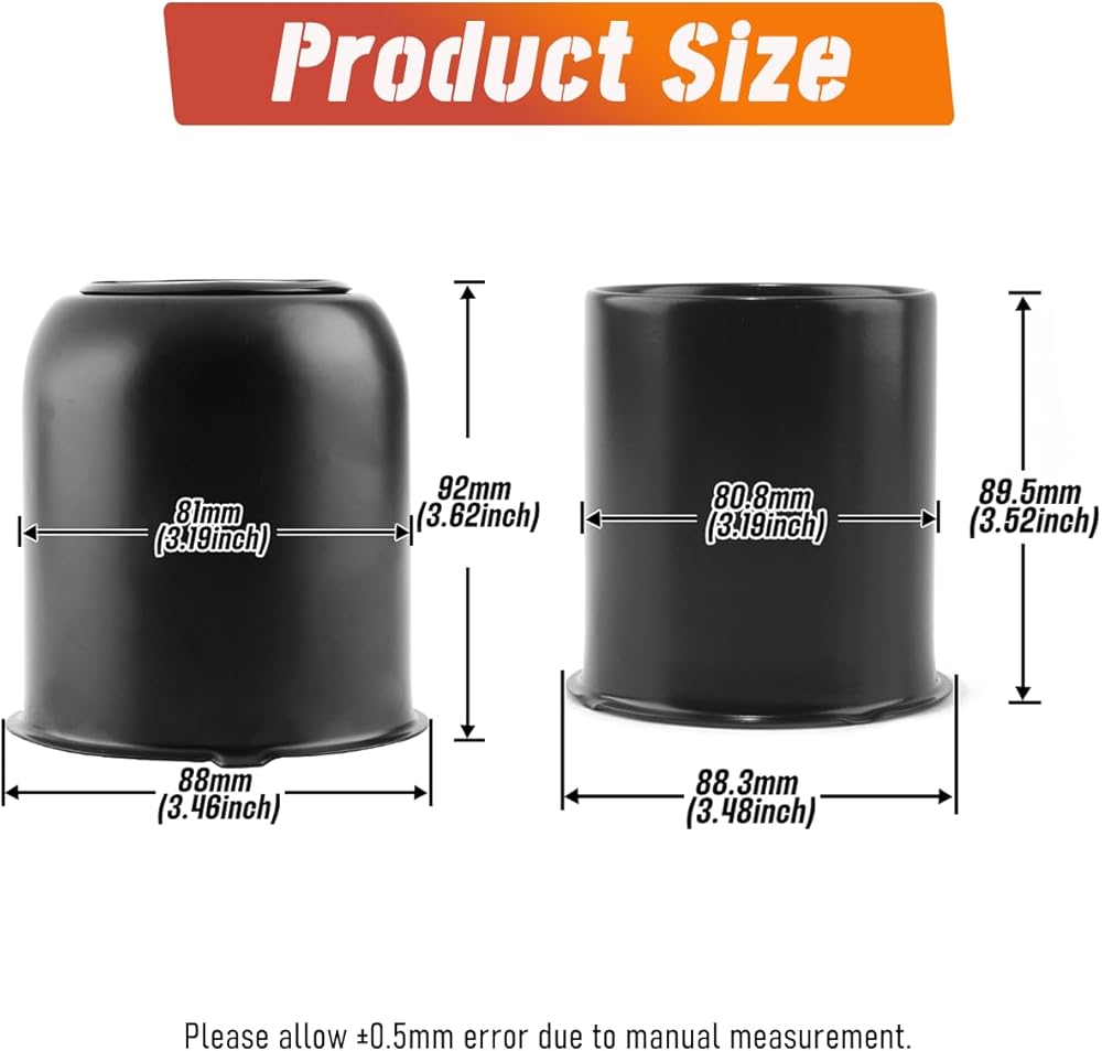 【أغطية مركز عجلة المقطورة】- مجموعة من أغطية مركزية مفتوحة الأطراف وأغطية مركزية علوية قابلة للإزالة، كل منها بقطر تركيب 3.19 بوصة، وارتفاع 3.52 بوصة لأغطية المحور المفتوحة، و3.62 بوصة لأغطية المحور العلوية القابلة للإزالة. إذا لم تكن متأكدًا من حجم الفتحة المركزية، فيرجى استخدام الفرجار الرقمي للتحقق. بالنسبة لنموذج قطر غطاء محور مركز العجلة، يكون خطأ المعلمة أقل من 0.5 مم، ويكون التركيب ناجحًا.