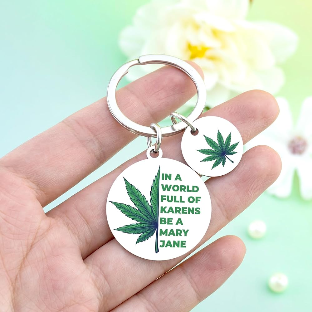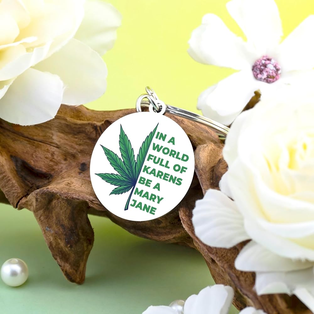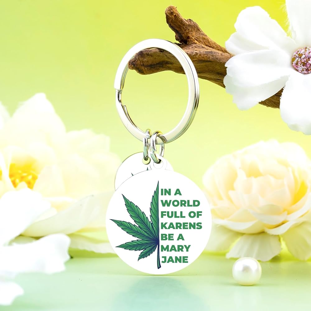 Stand out from the ordinary with the VIESUJI Weed Keychain, a statement piece for free spirits. More than just a keychain, it's a witty Cannabis Accessory and a perfect Weed Gift that celebrates individuality with its bold motto: "IN A WORLD FULL OF KARENS BE A MARY JANE."