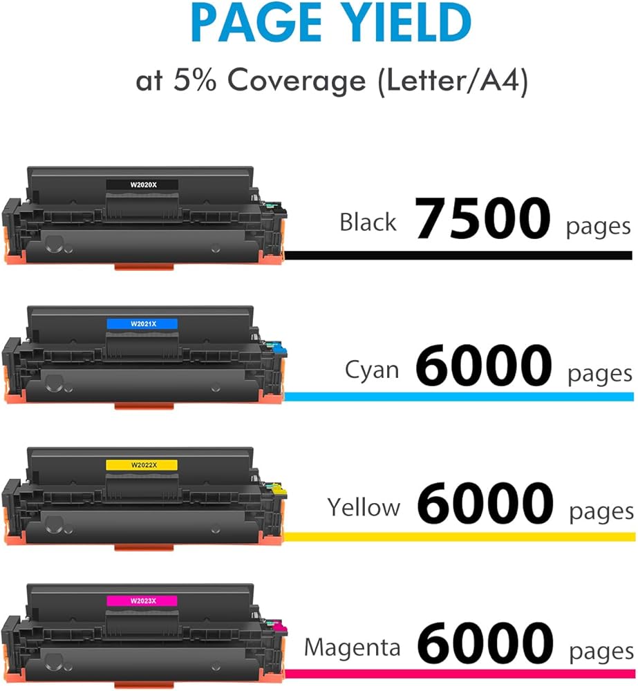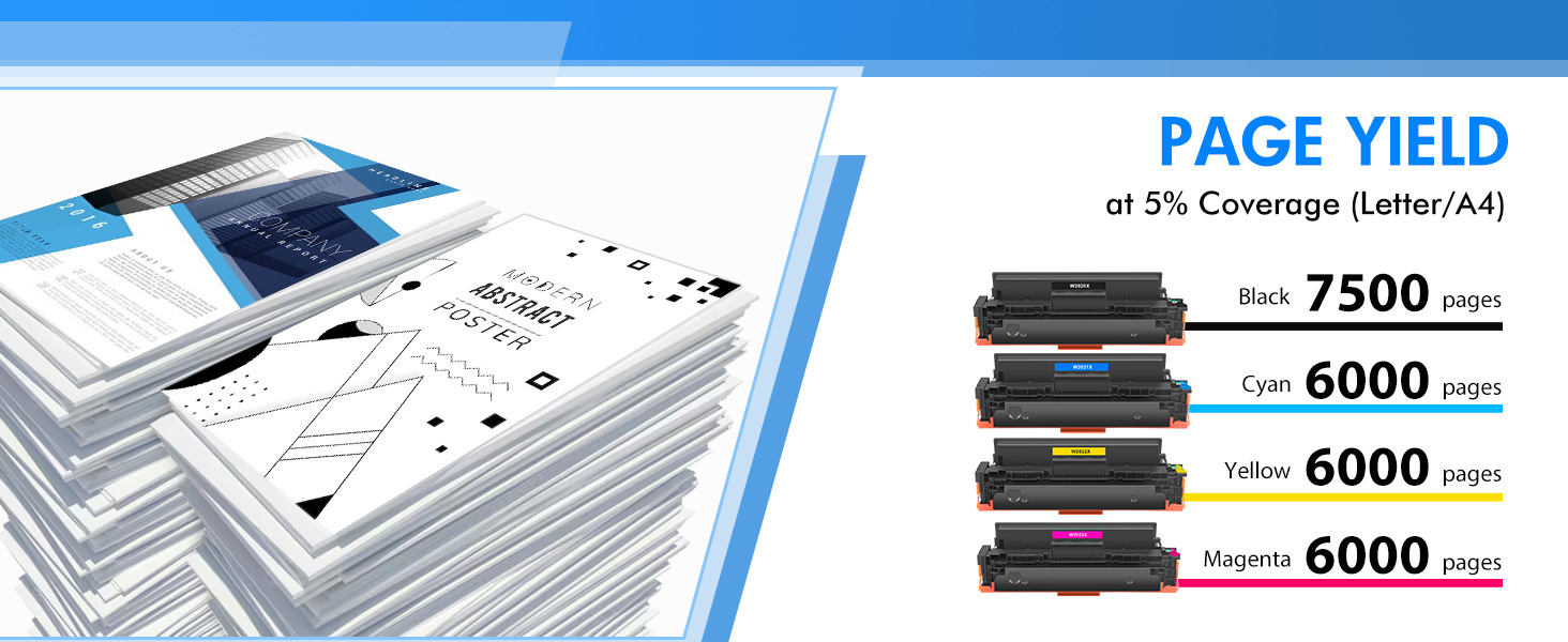 إنتاجية عالية للصفحة: ما يصل إلى 7500 صفحة للحبر الأسود 414X (W2020X) و6000 صفحة لكل 414X لون (W2021X W2022X W2023X) للحبر (Letter/A4، بتغطية 5%)