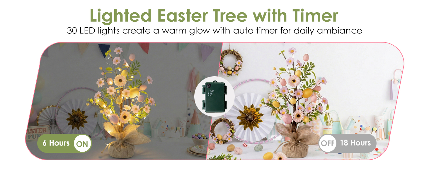 【 مصابيح LED دافئة مع مؤقت مناسب】تتميز شجرة عيد الفصح المضيئة هذه بـ 30 مصباح LED دافئ تضيف توهجًا مريحًا إلى ديكور عطلتك. يعمل المؤقت المدمج تلقائيًا لمدة 6 ساعات / 18 ساعة إيقاف، لذا تضيء زينة عيد الفصح كل مساء دون الحاجة إلى تشغيله مرة أخرى.