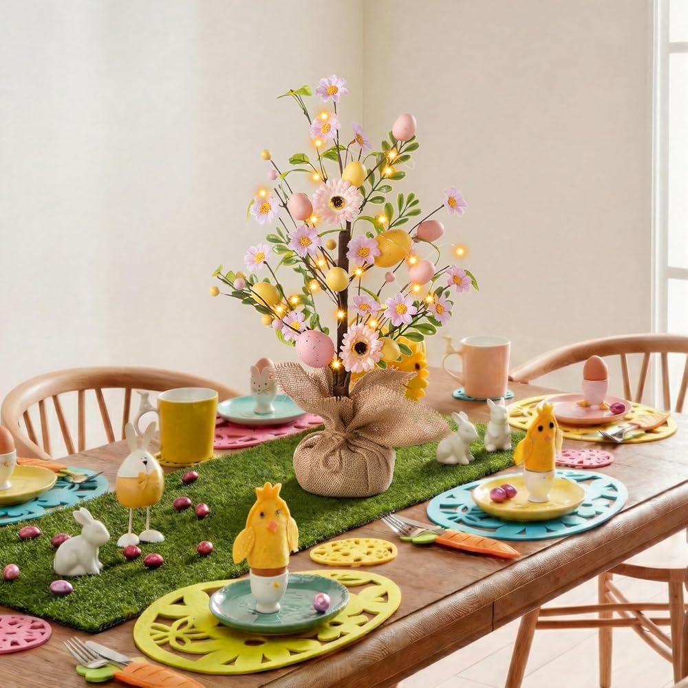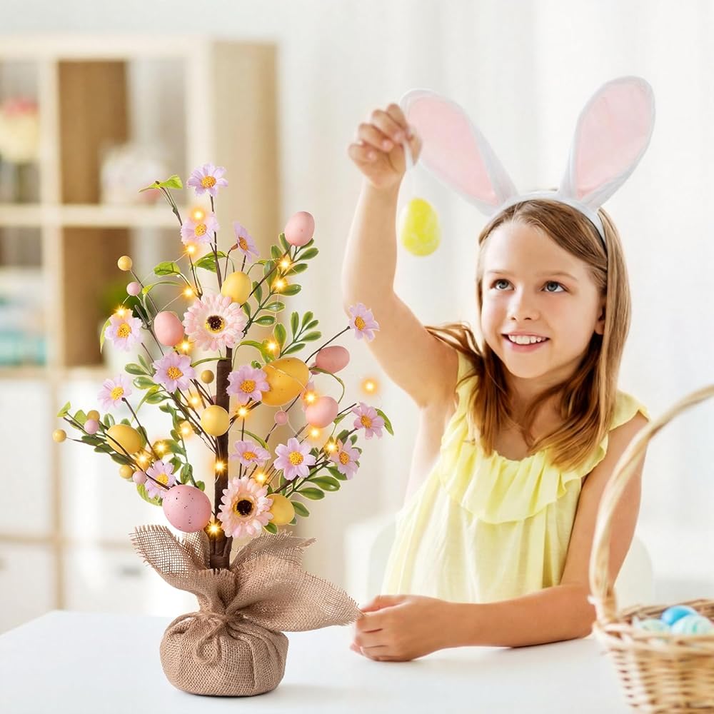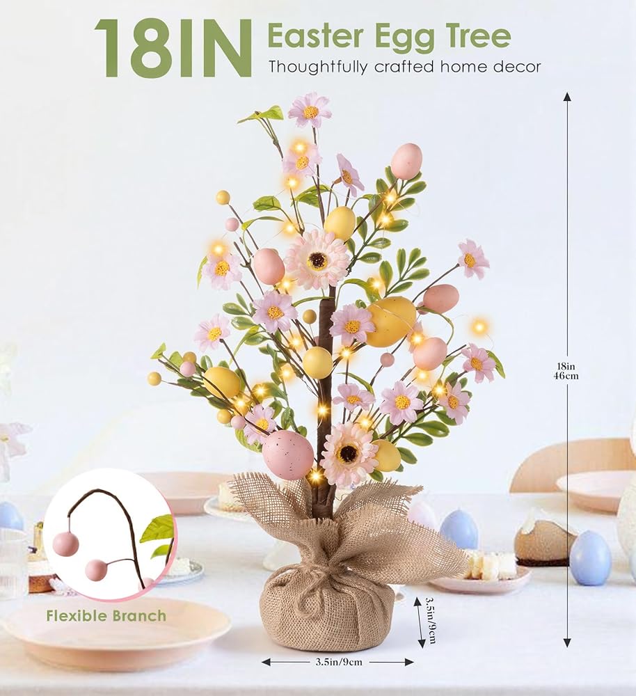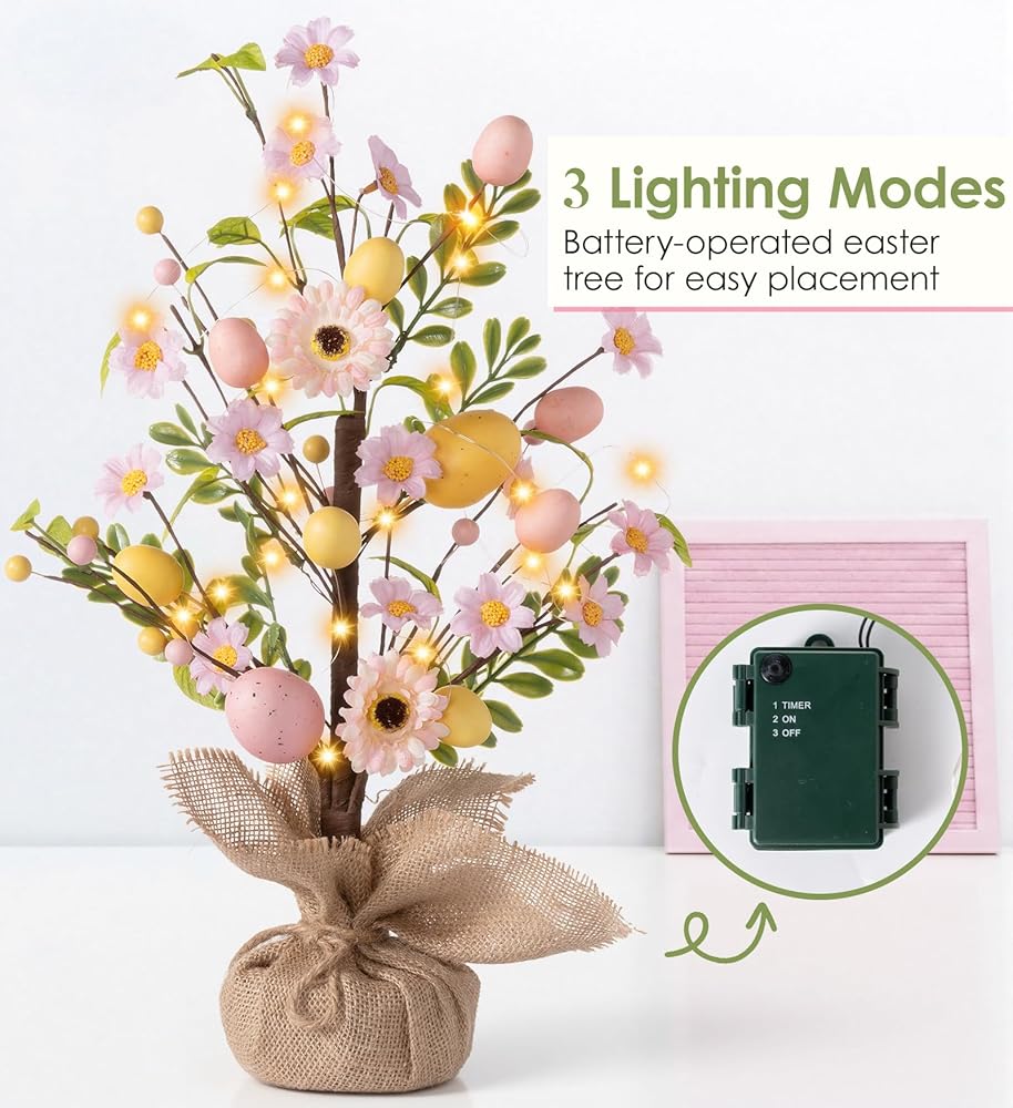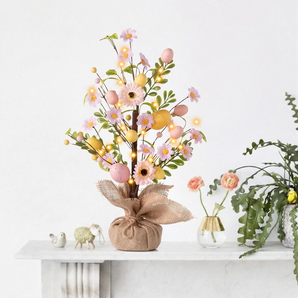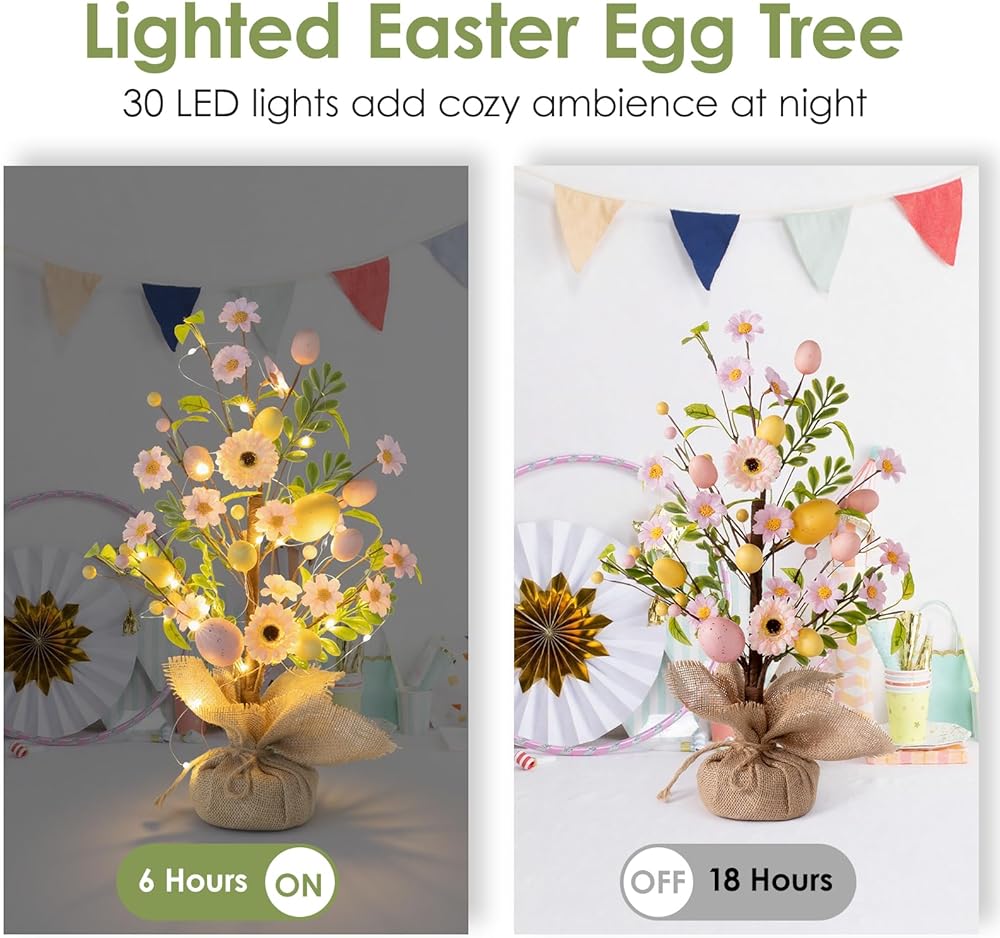 زينة عيد الفصح شجرة عيد الفصح المضاءة مسبقًا، شجرة بيض عيد الفصح على الطاولة مقاس 45.72 سم مع 30 مصباح LED ومؤقت، ديكور زنبركي يعمل بالبطارية لرف المطبخ على رف الطاولة