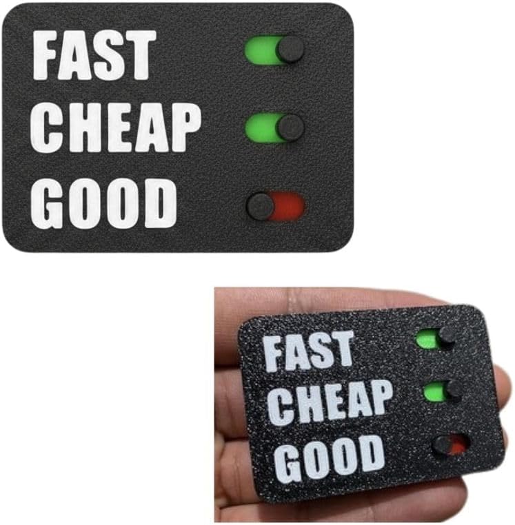"All functions are working." "Our stock levels will be updated. Stay tuned. Thank you for your interest." Bring a touch of humor and practicality to your workspace with this clever 3D-printed decision maker toy. Based on the classic project management triangle, this interactive desk accessory illustrates the age-old dilemma: Fast, Cheap, or Good - you can only pick two! The sliding markers let you visualize your priorities in a fun and engaging way, making it perfect for engineers, designers, and project managers who face these trade-offs daily. Each piece is carefully 3D printed using quality PLA material and hand-assembled for a professional finish. More than just a conversation starter, this desk toy serves as both a fidget-friendly stress reliever and a decorative piece that adds character to any office setting. Whether it's for your own desk or as a thoughtful gift for colleagues, this unique decision maker combines functionality with wit. The durable construction ensures it can withstand regular use while maintaining its sleek, professional appearance. It's an ideal addition to home offices, corporate environments, or creative workspaces where tough decisions need a dash of humor.