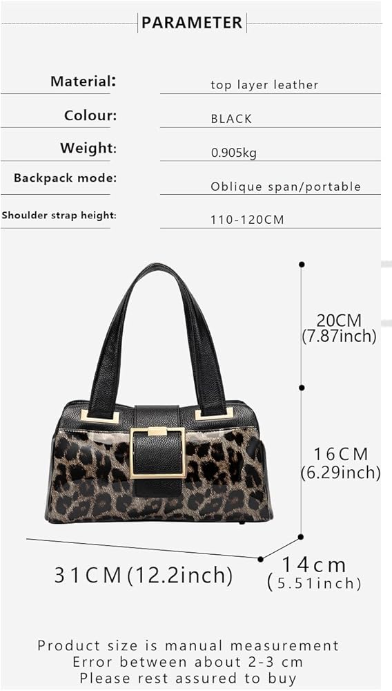 This women's handbag is a stylish and practical accessory crafted from top - layer cowhide, ensuring durability and a luxurious feel. The leopard - print design, combined with black leather and gold - tone hardware, gives it a trendy look. It features multiple carrying ways – portable or oblique span. With well - designed internal pockets, it offers organized storage for essentials like phones, cosmetics, and wallets. Its compact size (31CM×20CM×14CM) and lightweight (0.905kg) make it perfect for daily use, adding both fashion and convenience to your life.