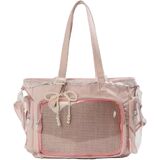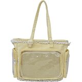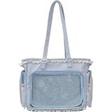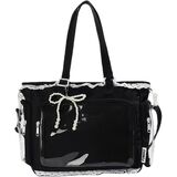 DESIGN FEATURES: Black transparent display tote with elegant pearl bow trim, ruffle lace details, and mesh insert panel perfect for showcasing pins and accessories
